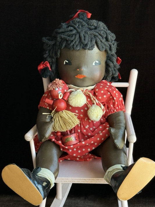 Unidentified Vintage 15” Dark Complexion Oilcloth African American Girl Doll