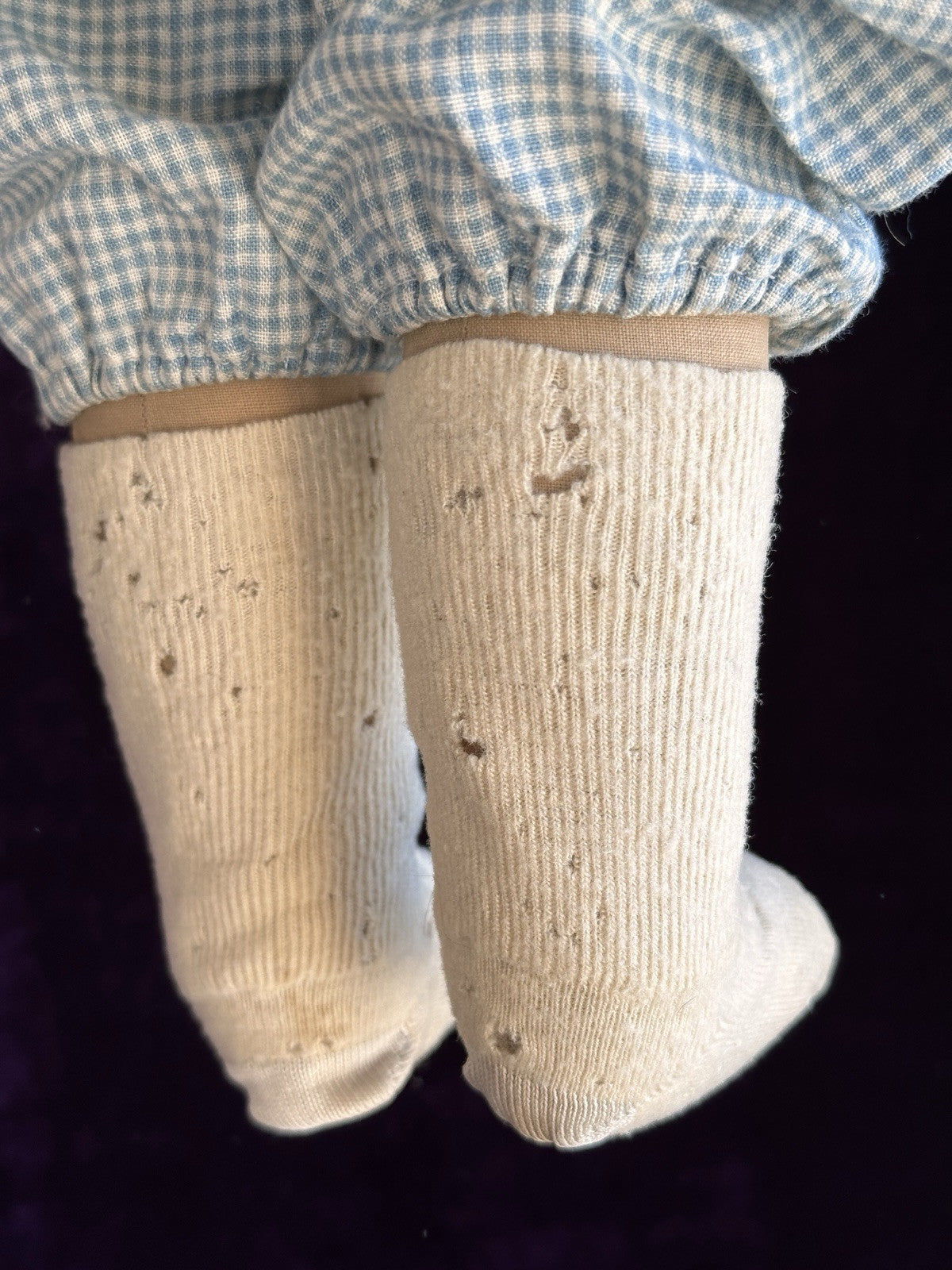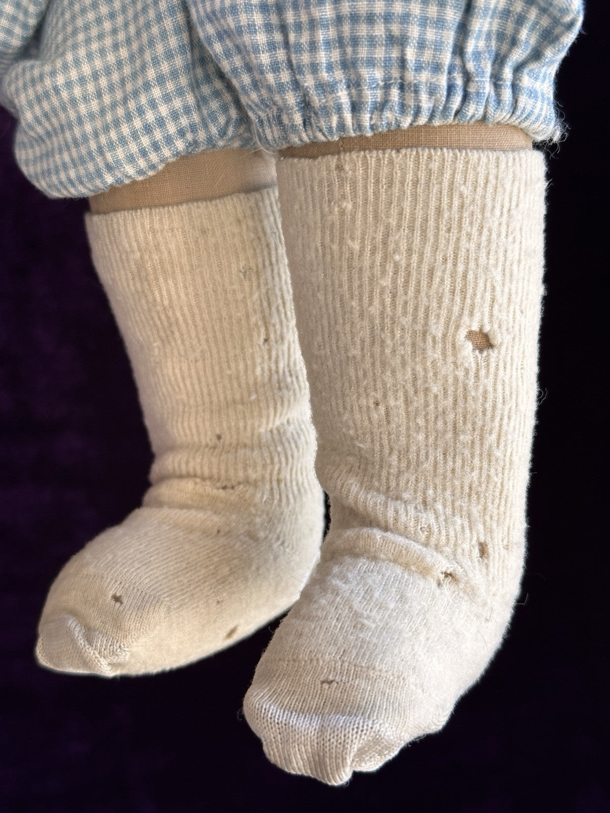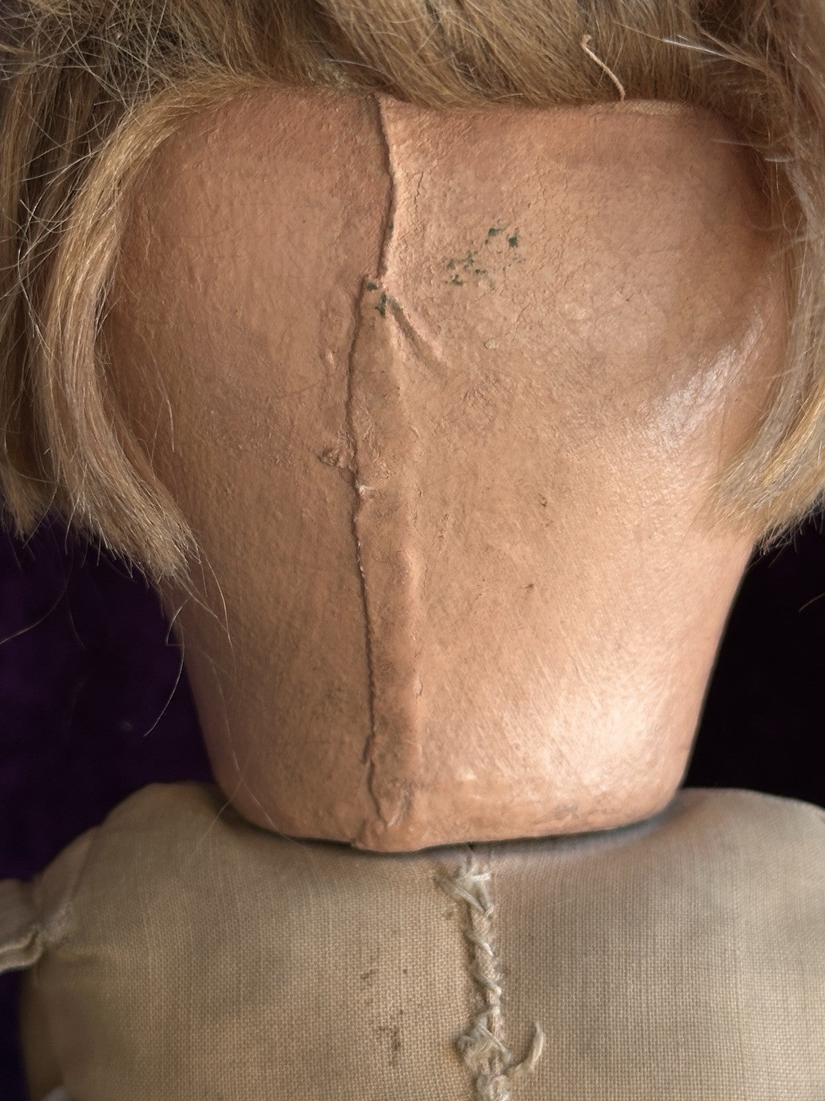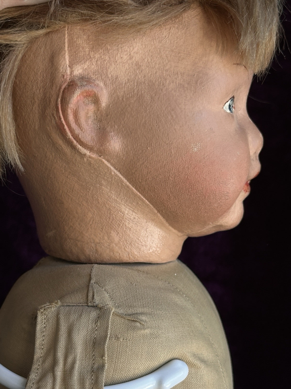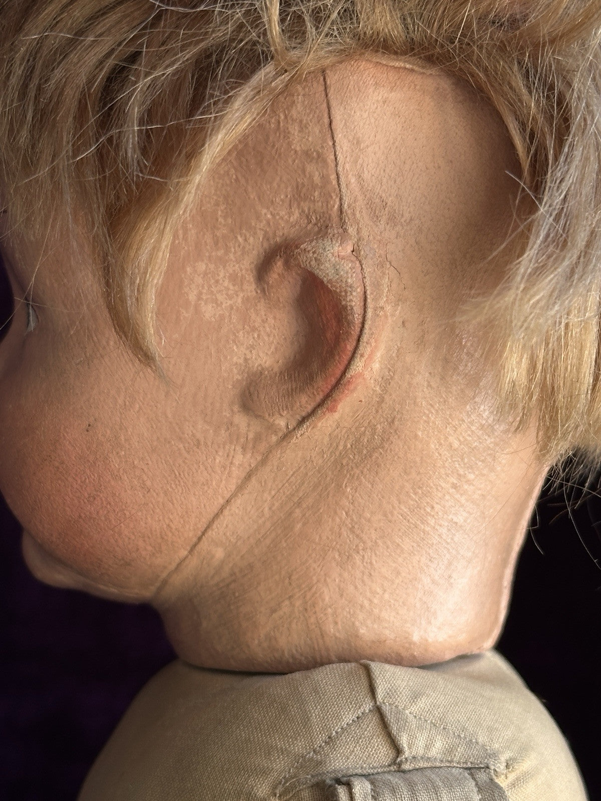 Adorable old doll! The boy is nicely preserved. There is possibly repaint to the neck and chin, but we are not sure about it. There is a repair to the right arm. Other wear is very light. The doll is coming with crier that is not working. The hair is original and it is just a little worn. Looks like the outfit of the doll is original. It is in a good condition. Holes to the socks. Please refer to the pictures for more details. No chair or the stand are included.