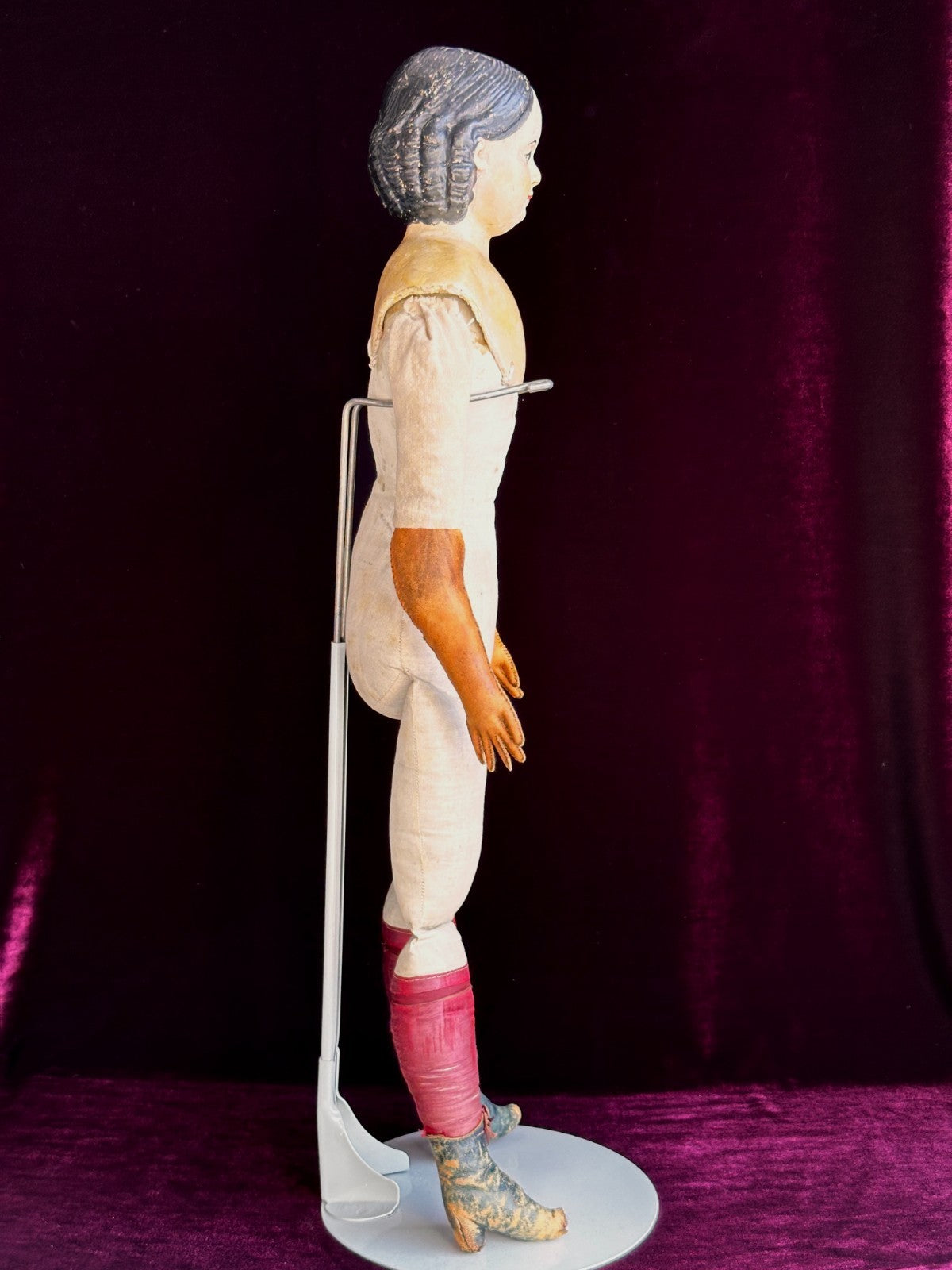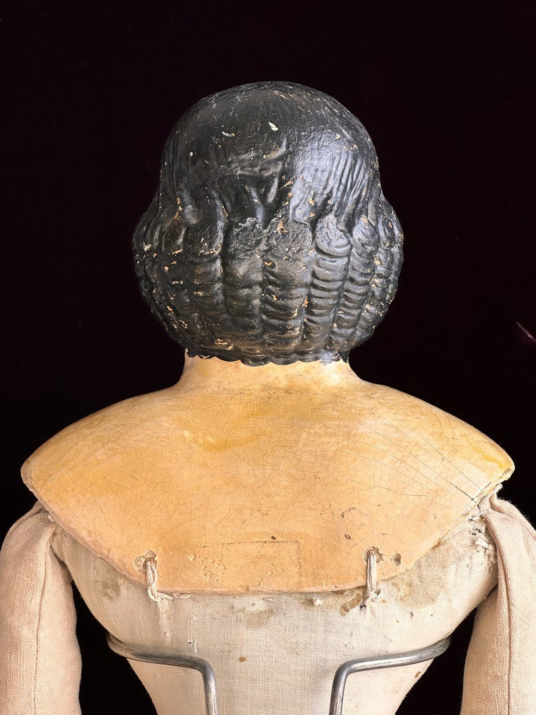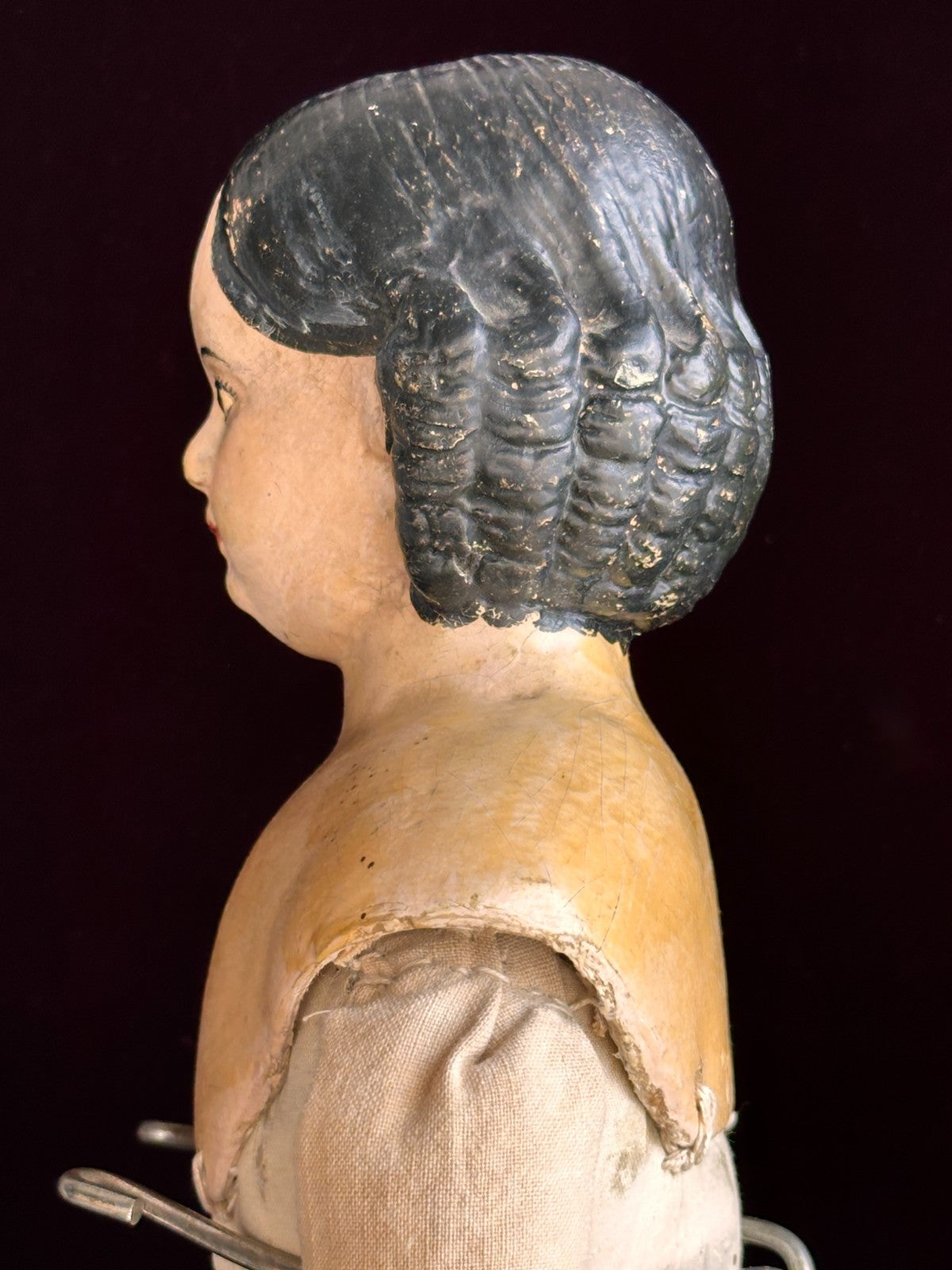 Very pretty doll in great condition. The doll has a papier-mâché head that shows some paint touch-ups to the face and possibly to the hair area. Other than that, the head is in pretty good condition. The label is missing.