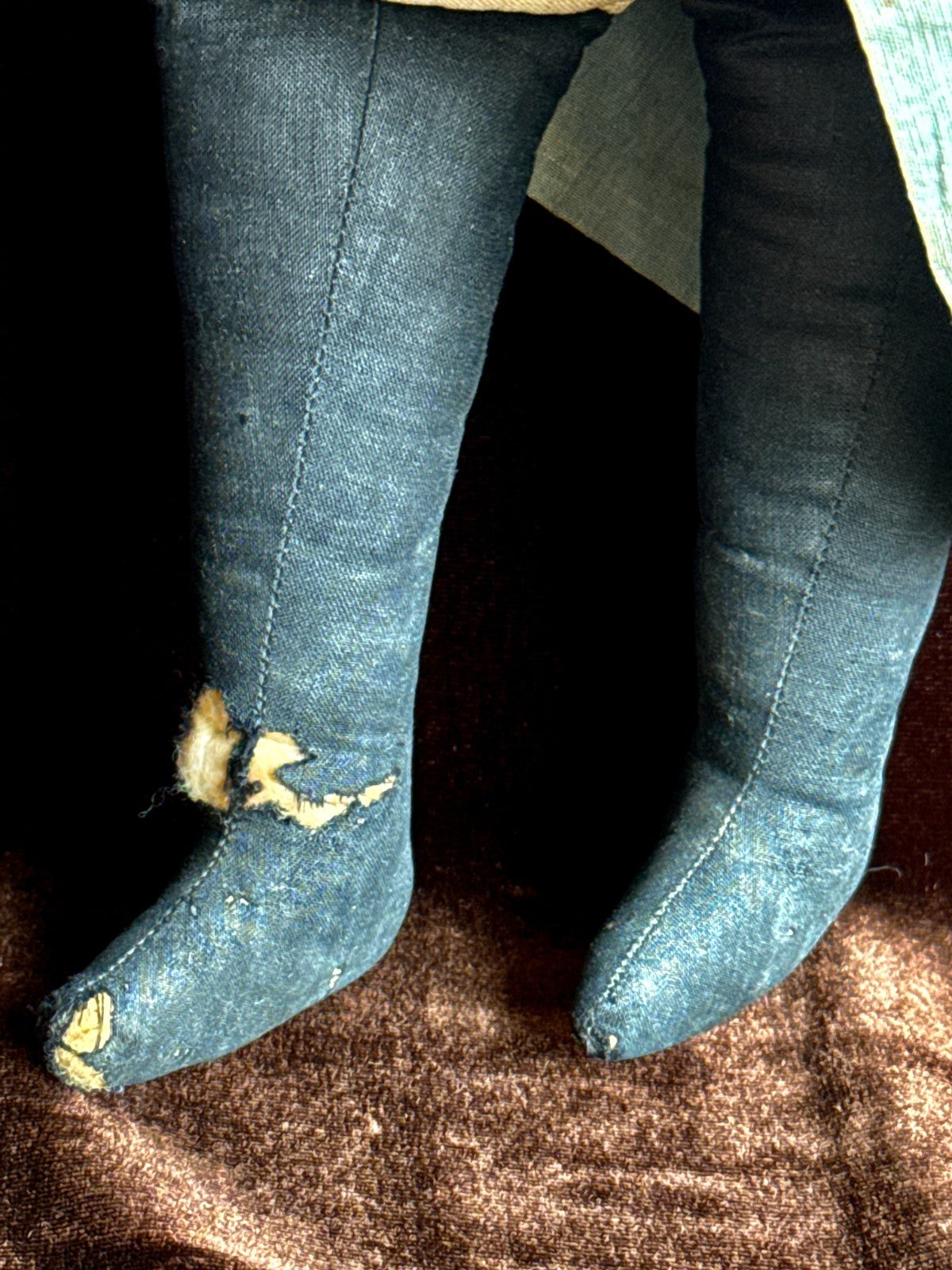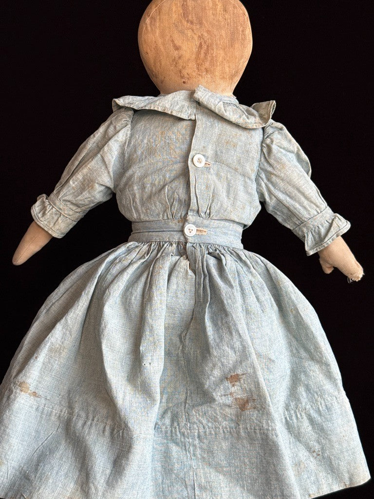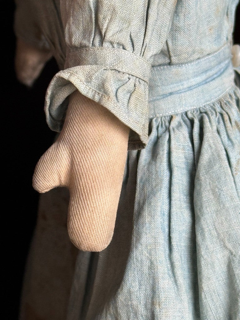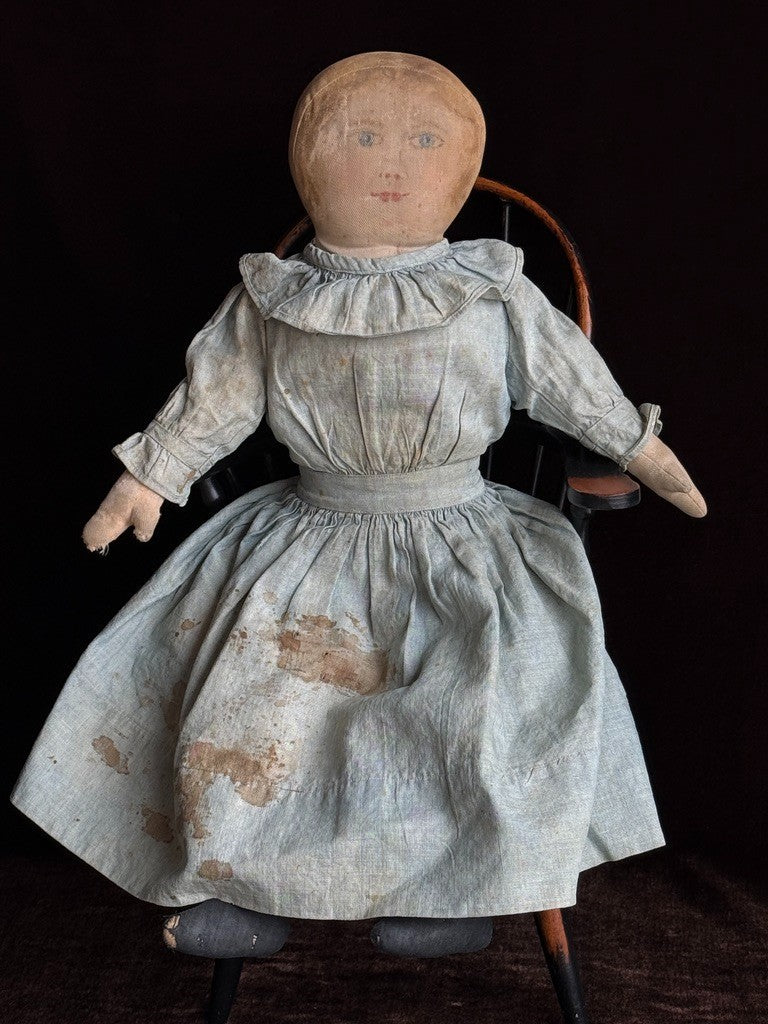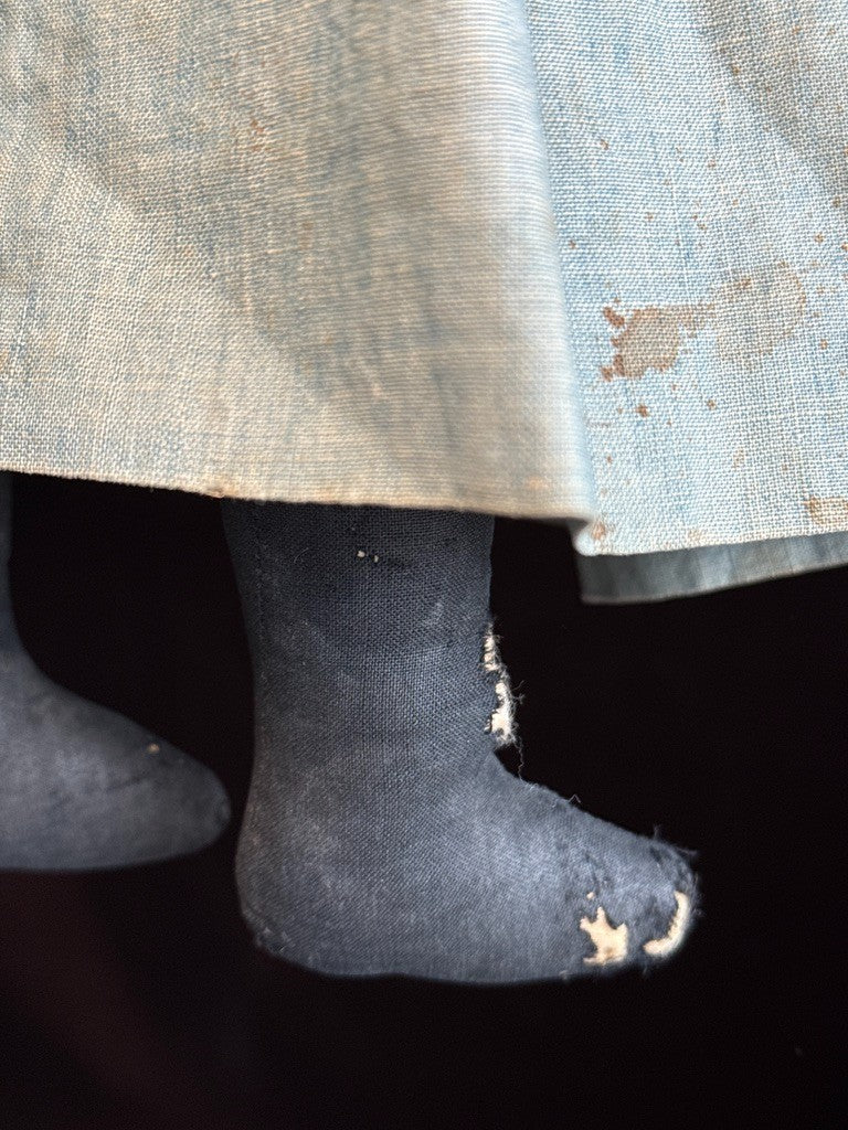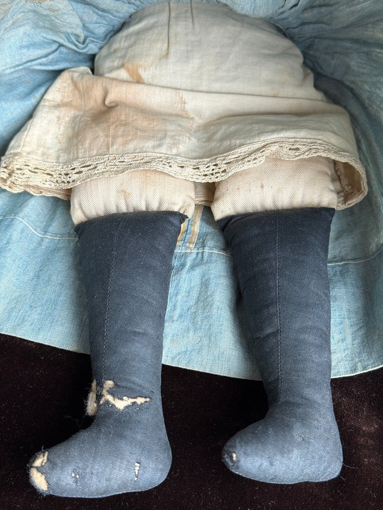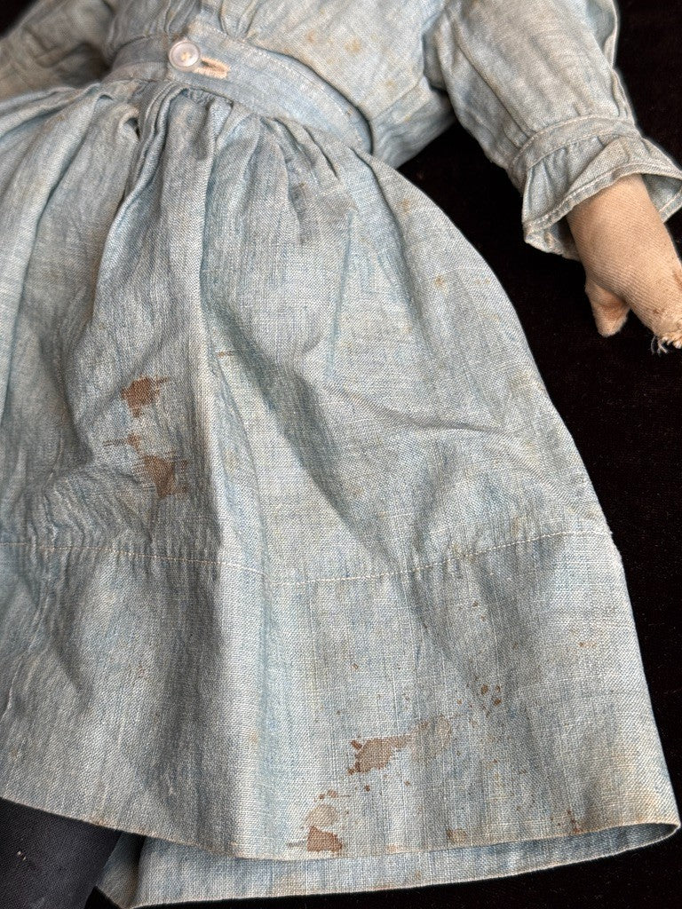 Beautiful doll, likely missing her bonnet. The face paint is preserved but slightly faded. Despite her age, she remains nicely preserved, though she does show wear, including holes and tears to one leg, with additional wear to the other leg. There are small imperfections to the head and some wear to the right arm. The clothing is stained, and there are also some stains to the body.