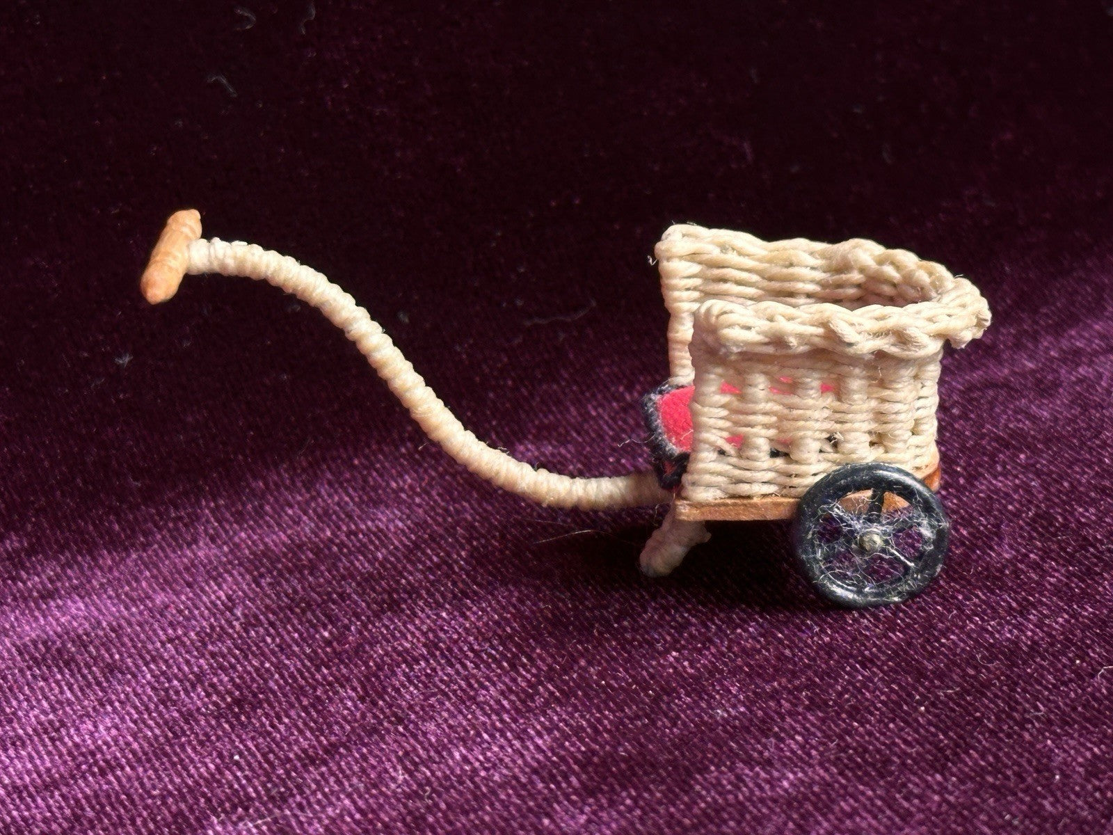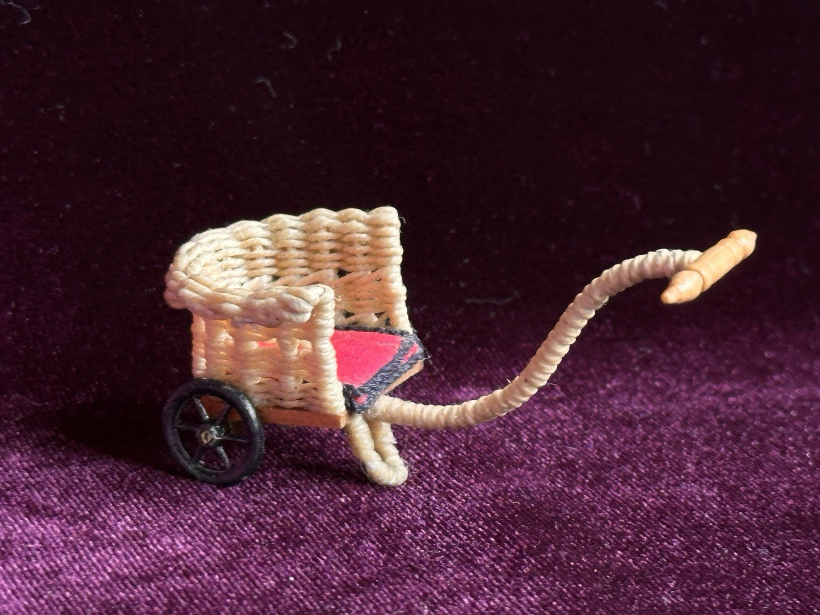 The dolls are accompanied by a vintage handmade carriage that beautifully incorporates and displays them.