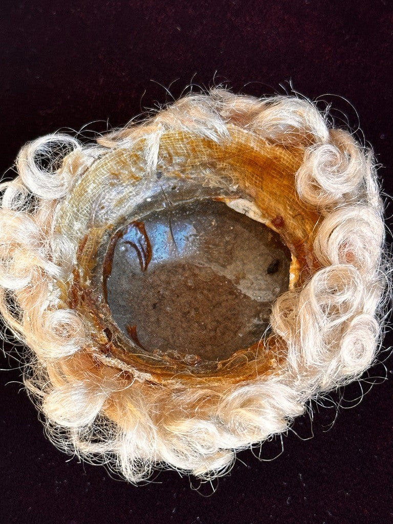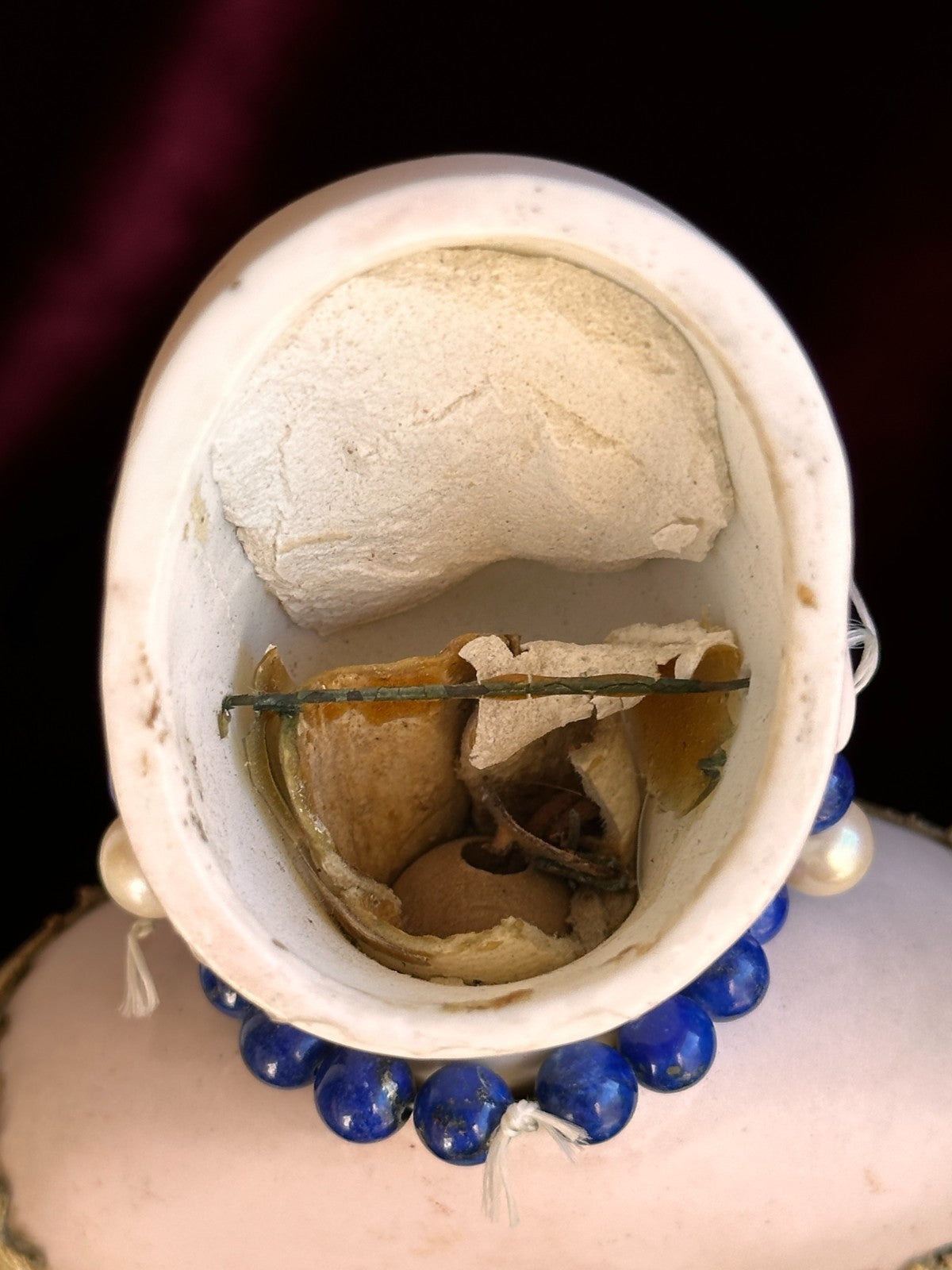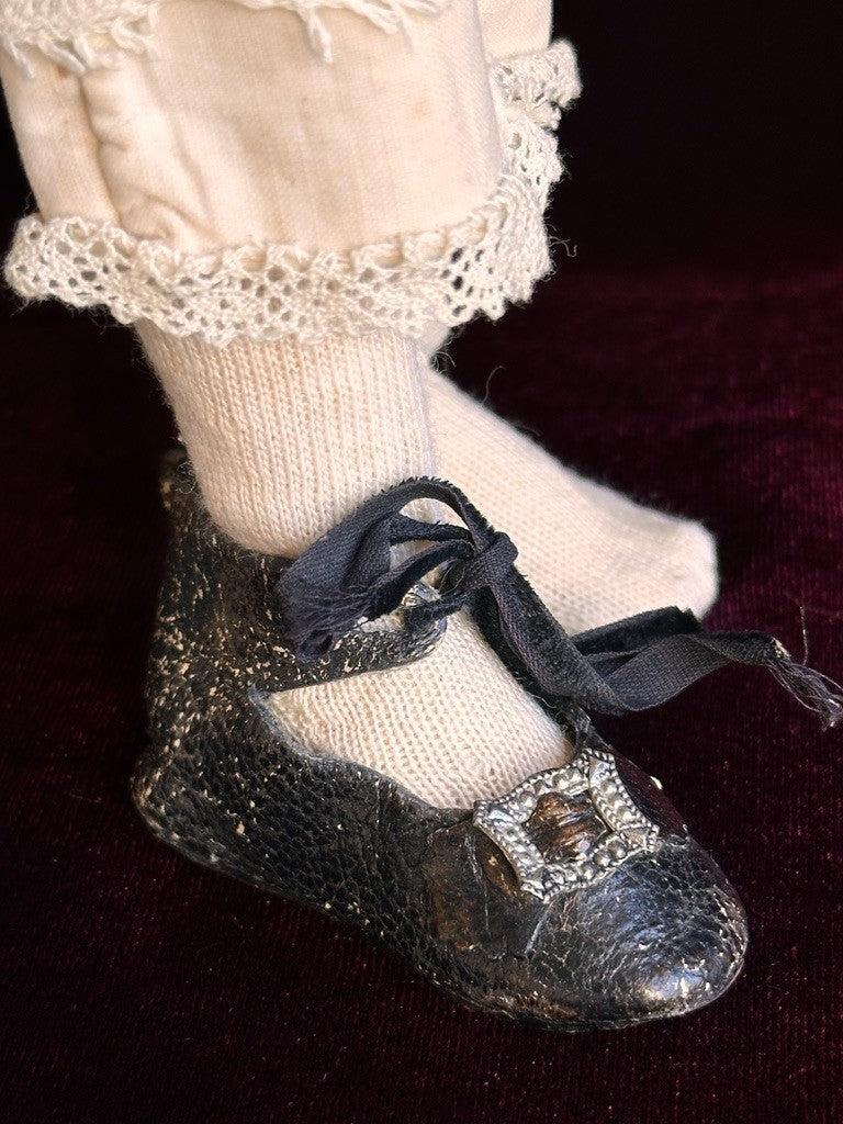 The lady is dressed as shown. She is missing one shoe. There are holes and stains to the petticoat. The antique outfit is in overall good condition but looks like it needs some cleaning and possibly ironing. The outfit does not appear to be original to the doll.