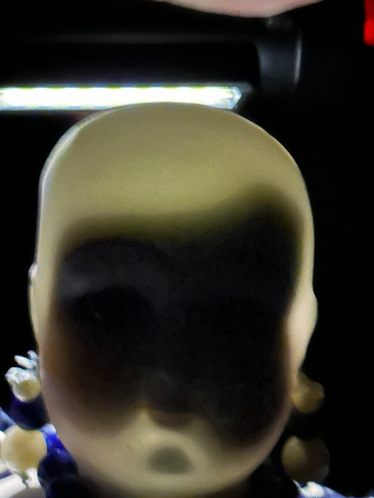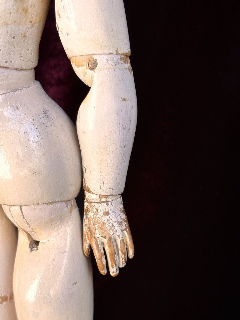 The body shows typical wear to the surface paint. All parts of the doll are well attached and move properly — some joints are tighter, and some are a little looser. The wig looks like a replacement, and the doll has no original wooden pate.