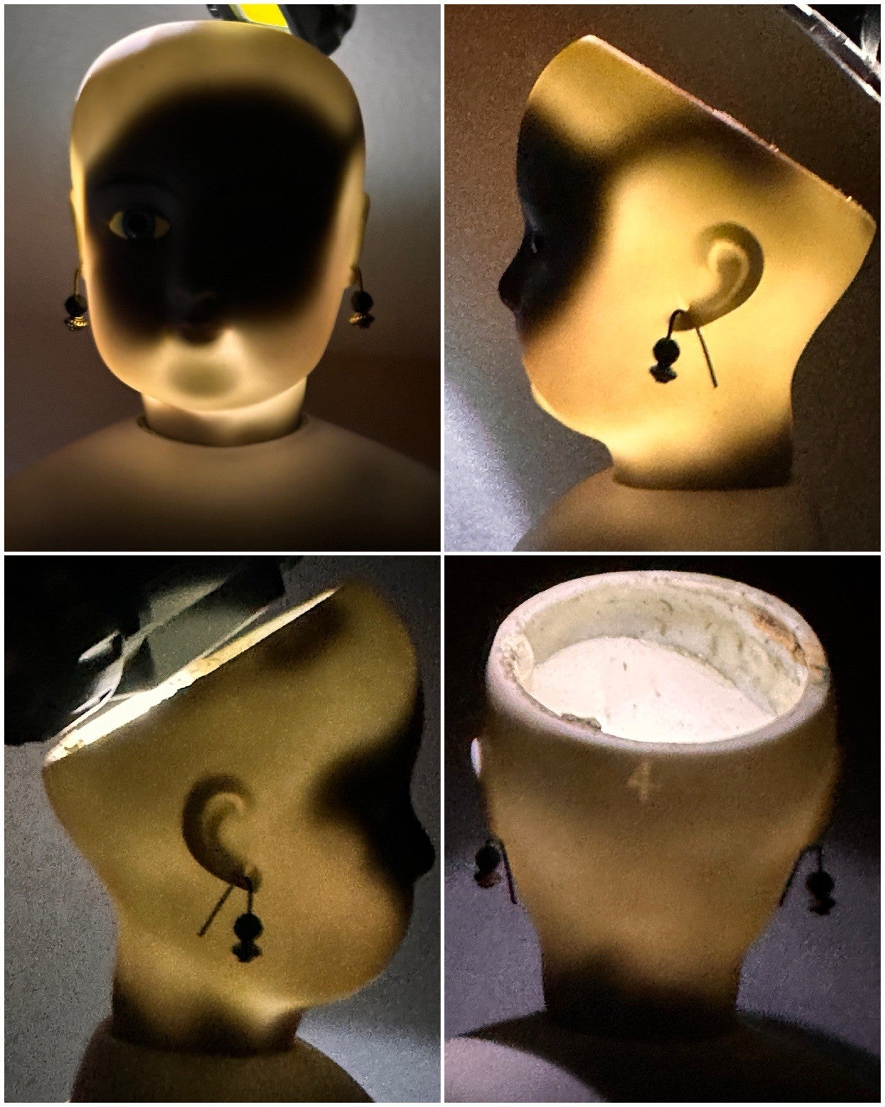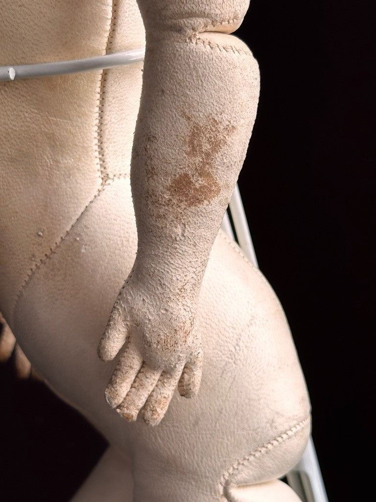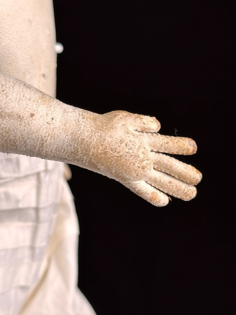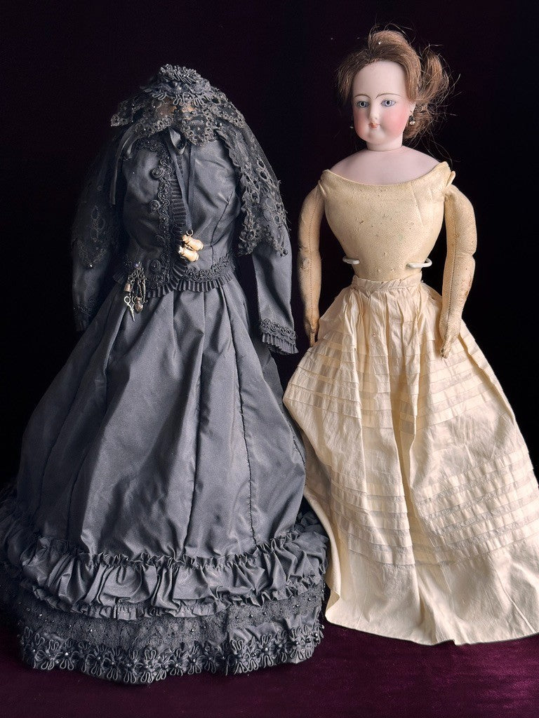 She is coming with two dresses. Both look antique, though one of them may be a slightly later vintage replacement. The brighter outfit is very worn and has holes, stains, and tears, but it is still very beautiful. The black outfit, which comes with a cape and a beautiful hat or hair decoration, is in very good condition.
