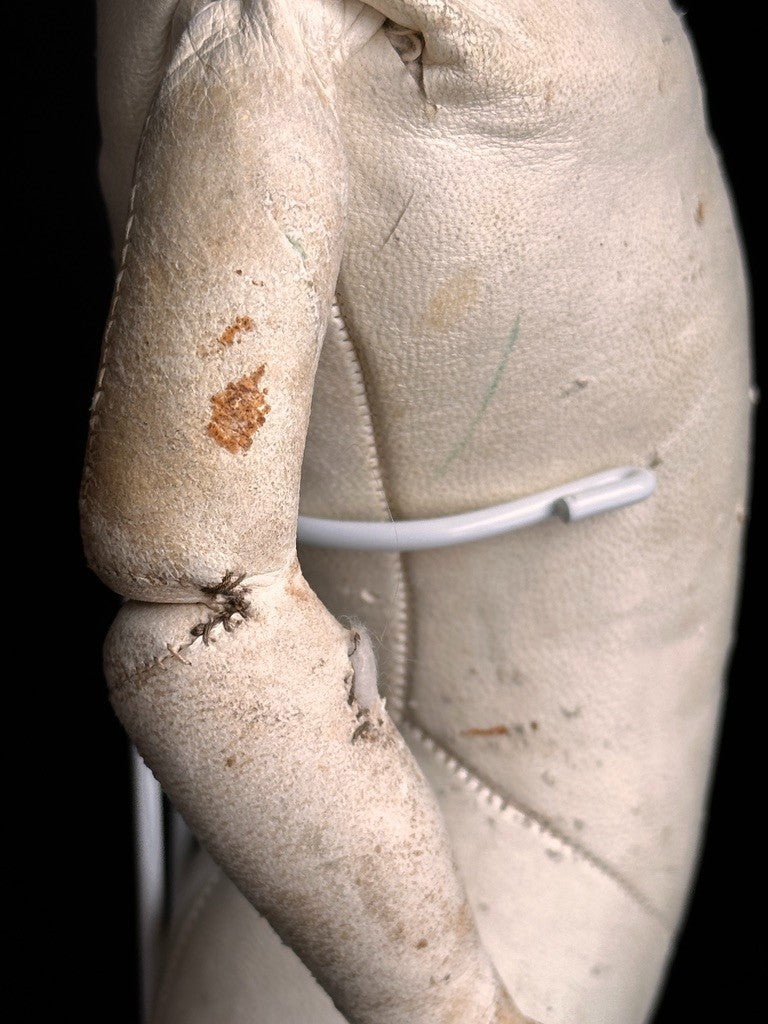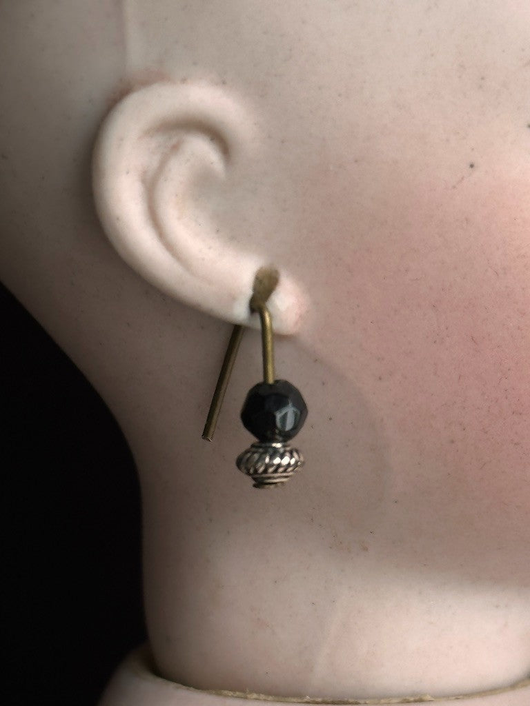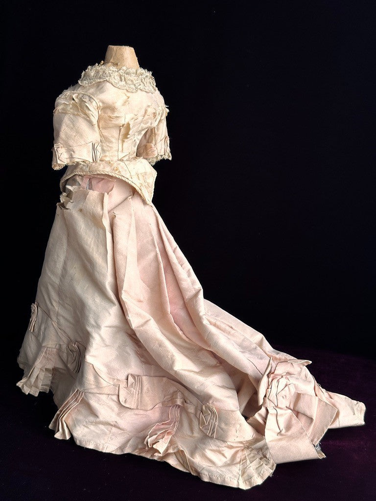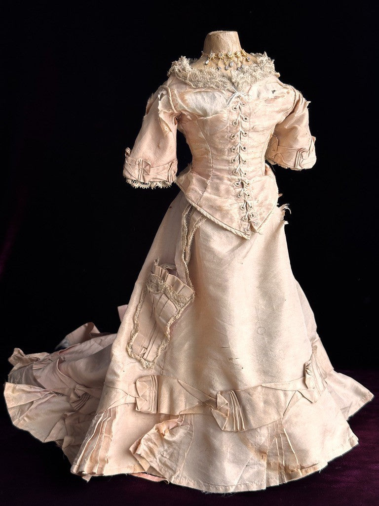 She is coming with two dresses. Both look antique, though one of them may be a slightly later vintage replacement. The brighter outfit is very worn and has holes, stains, and tears, but it is still very beautiful. The black outfit, which comes with a cape and a beautiful hat or hair decoration, is in very good condition.