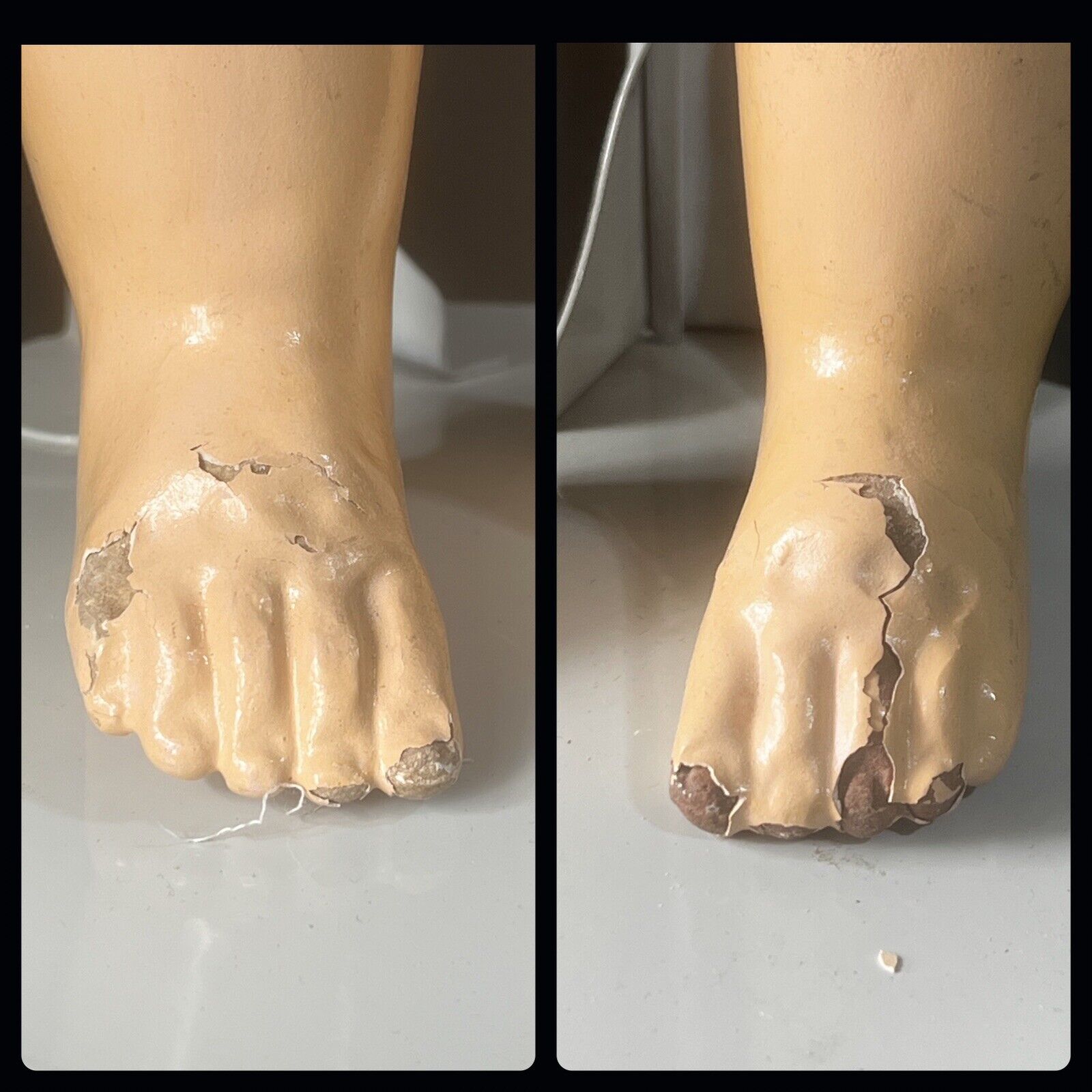 Original to this doll. Original sticker is present - see photo. Stringing is good. Some chipped/cracked ares to her body are present - see photos. Mostly to hands fingers and toes.