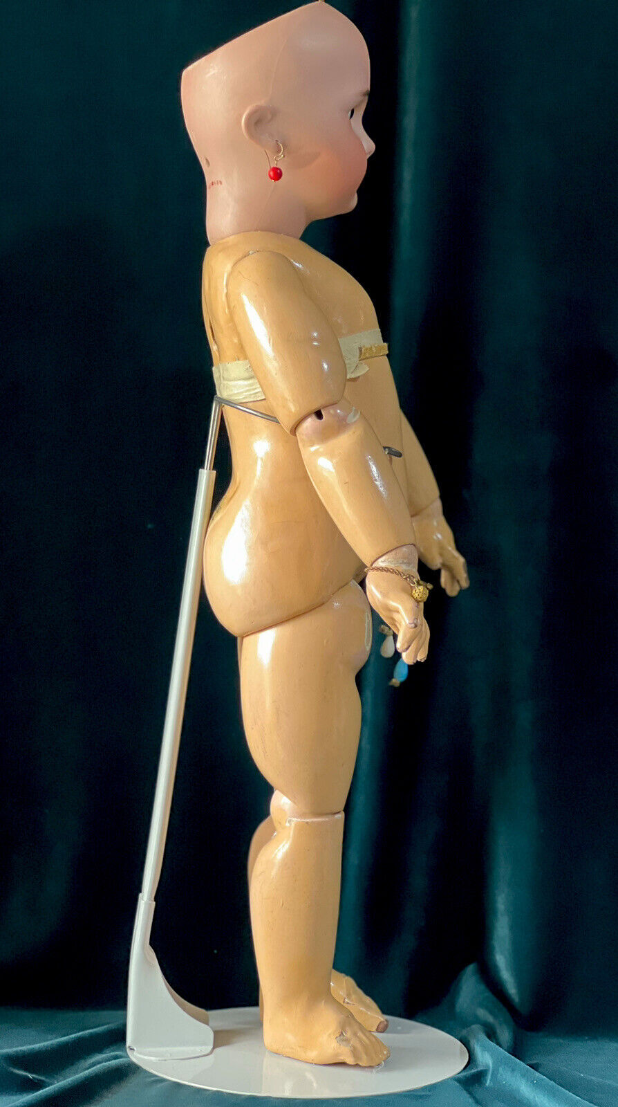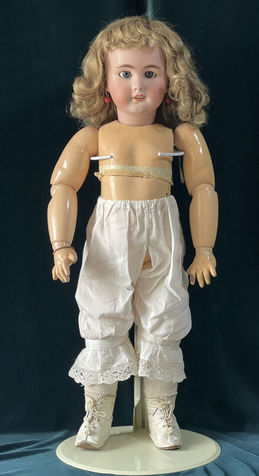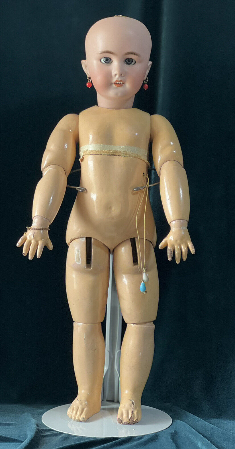 Grey glass eyes are a little bit loose inside but are not broken or misplaced. Sleepy eyes mechanism is working. Upper lashes are missing. Pierced ears; earrings are new. Small chip to the left earlobe.