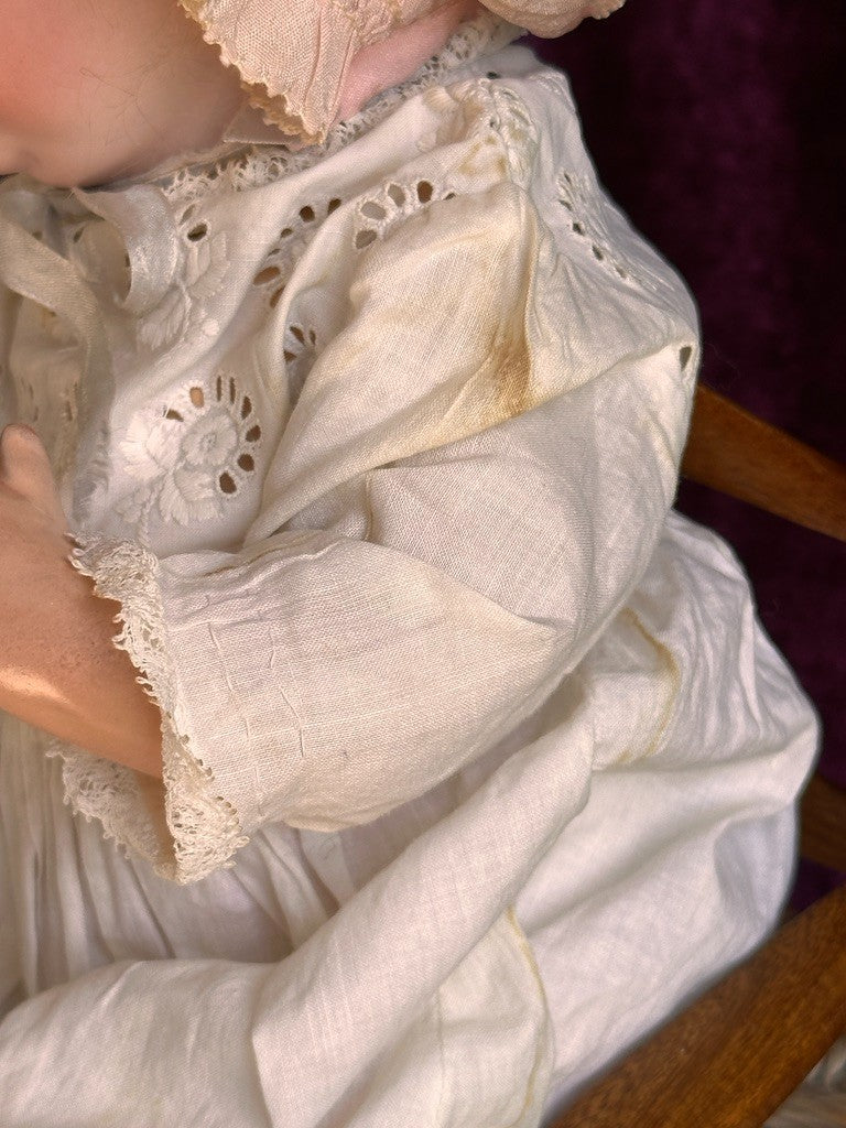 The baby is beautifully dressed. The gown has stains and a hole on the back, which are shown in the photos.