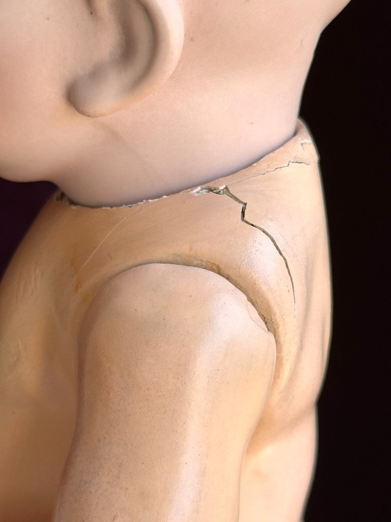 The body shows some damage and repairs, including a crack to the torso, a repair to the right arm, and a repair to the left leg. The original finishing is still present, and the doll has good stringing. The wig is a replacement.