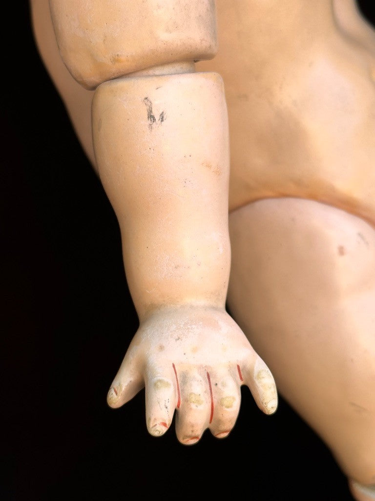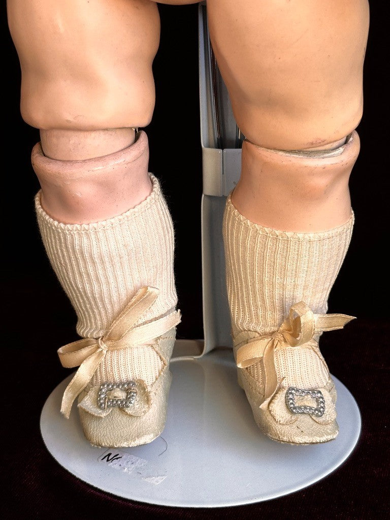 She is in great condition with no damage. There is just light wear to the composition body. She has working sleepy eyes. The wig is tightly glued, with what appears to be the original plaster pate underneath. The wig and pate were not removed, but the eyes will be safely protected for shipping. Good stringing to the doll.