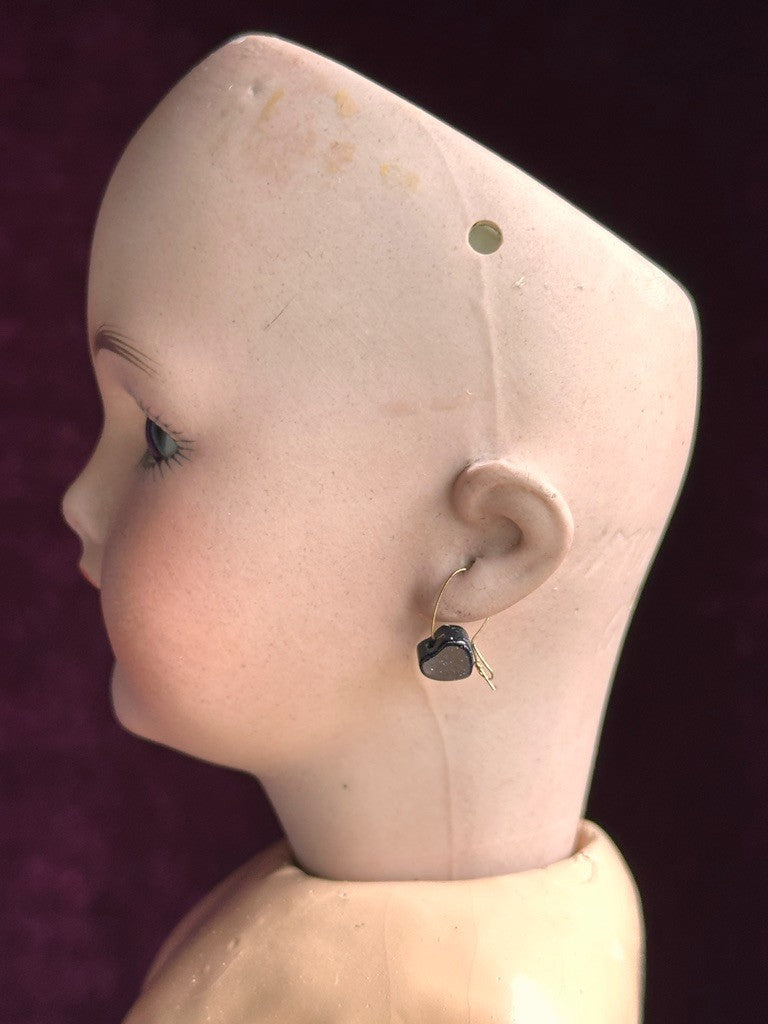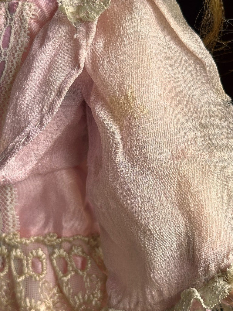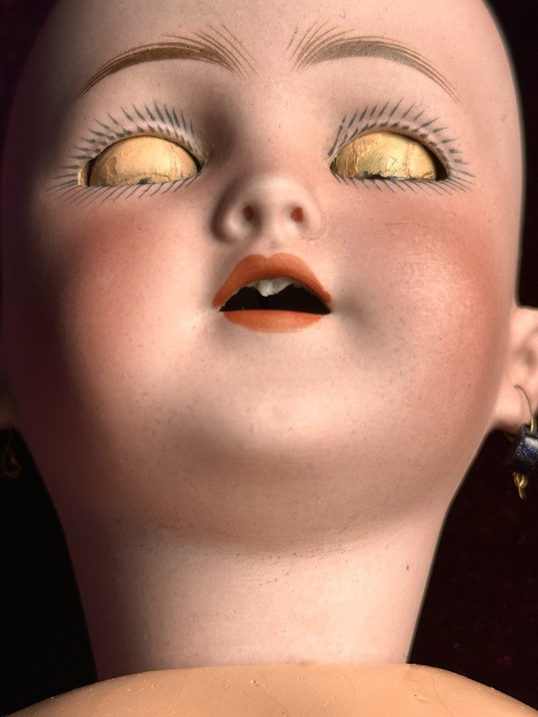 This beautiful little girl has working sleepy eyes. It looks like the eyelids were repainted. There are a couple small wig pulls to the top of the head. The paint on the bisque is a little rough, but there are no repairs, hairlines, cracks to the bisque. The doll's teeth are broken. The shape of the right eye is a little unusual — it could be a production defect or possibly a chip. It is hard to identify what exactly it is.