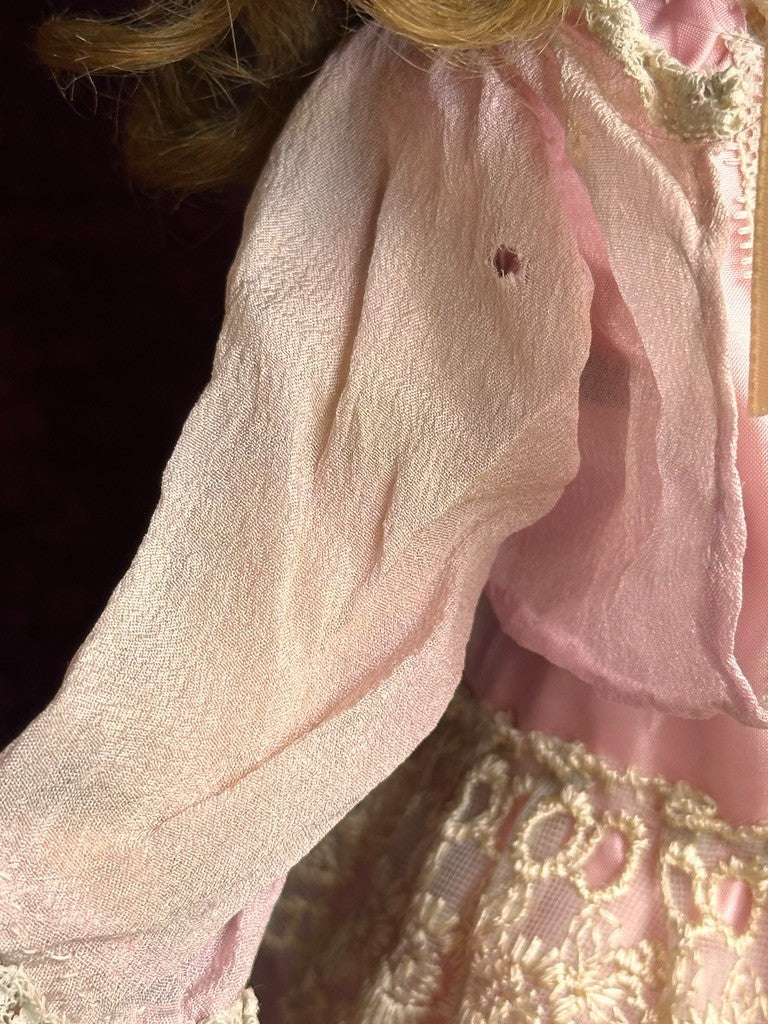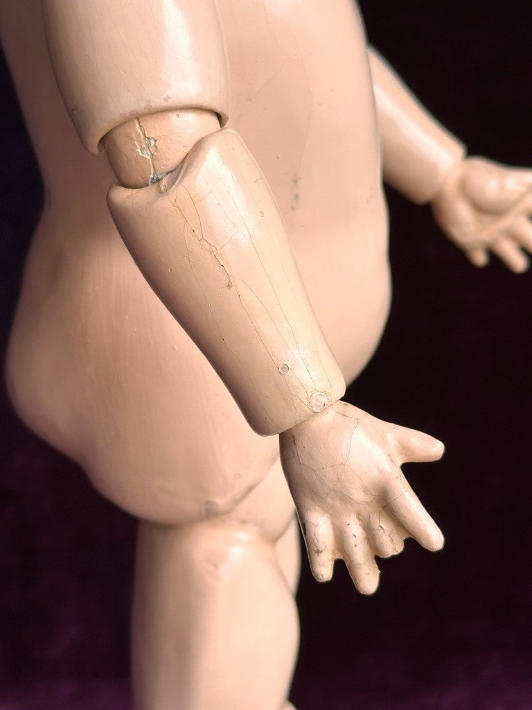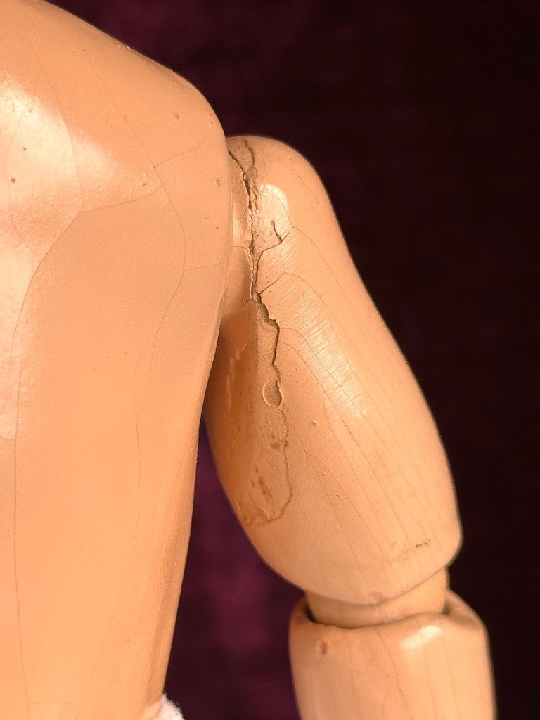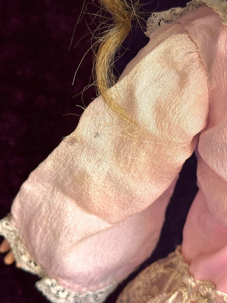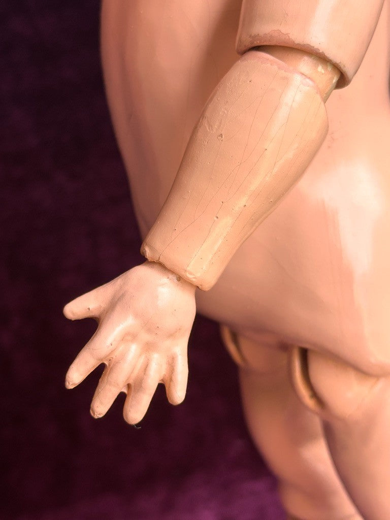 Her original wig is in great condition. Comes with pate. The body appears to have been repainted and shows a broken finger on the right hand along with some cracks to the arms. Otherwise, the body is in nice condition. Stringing is good.