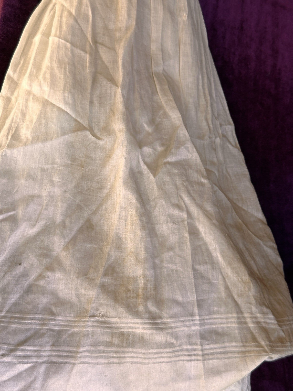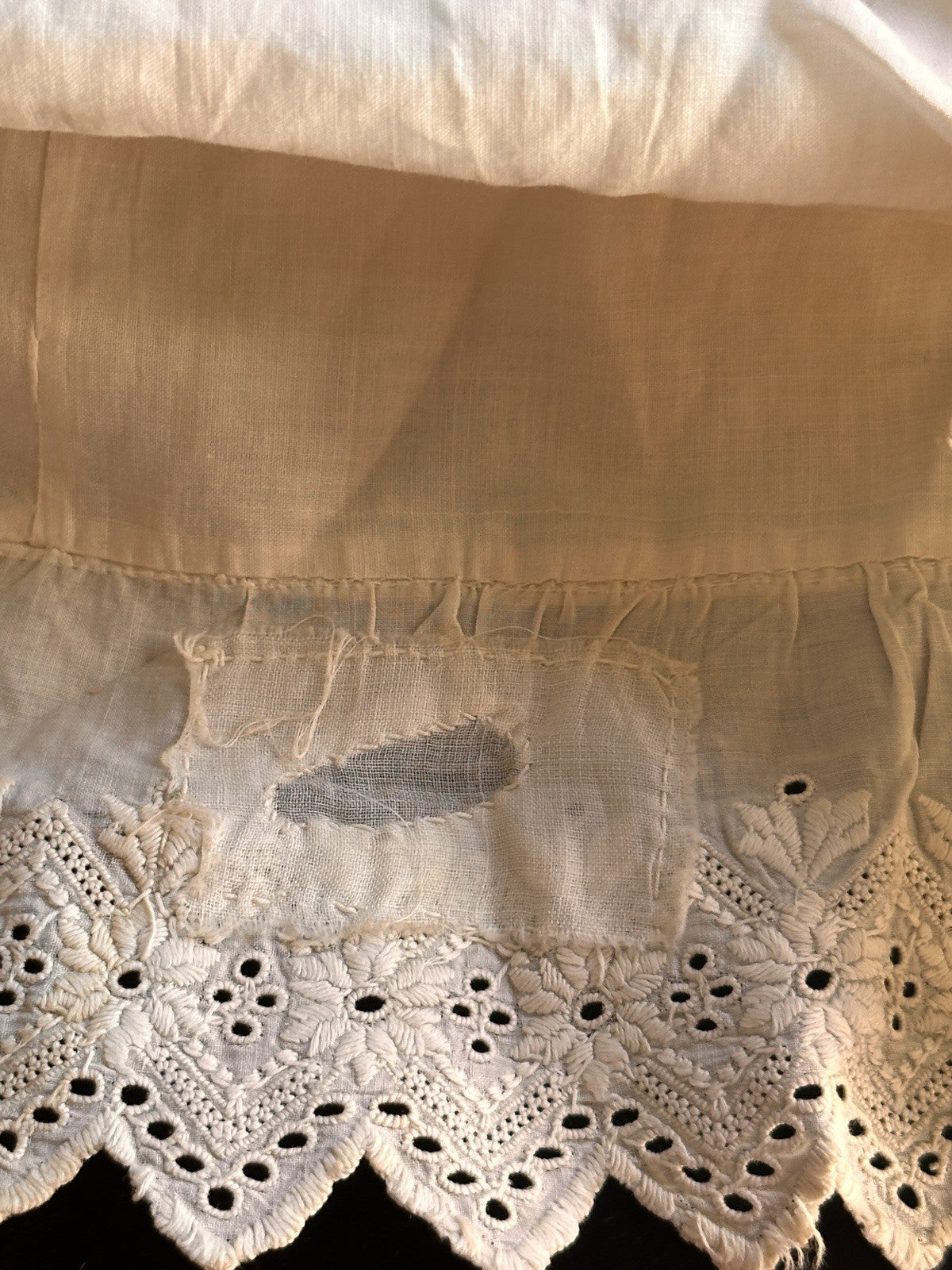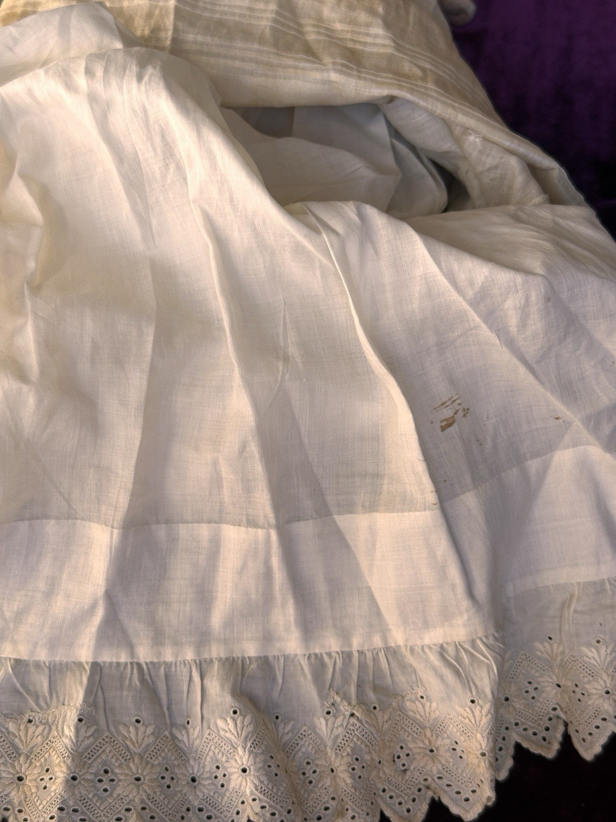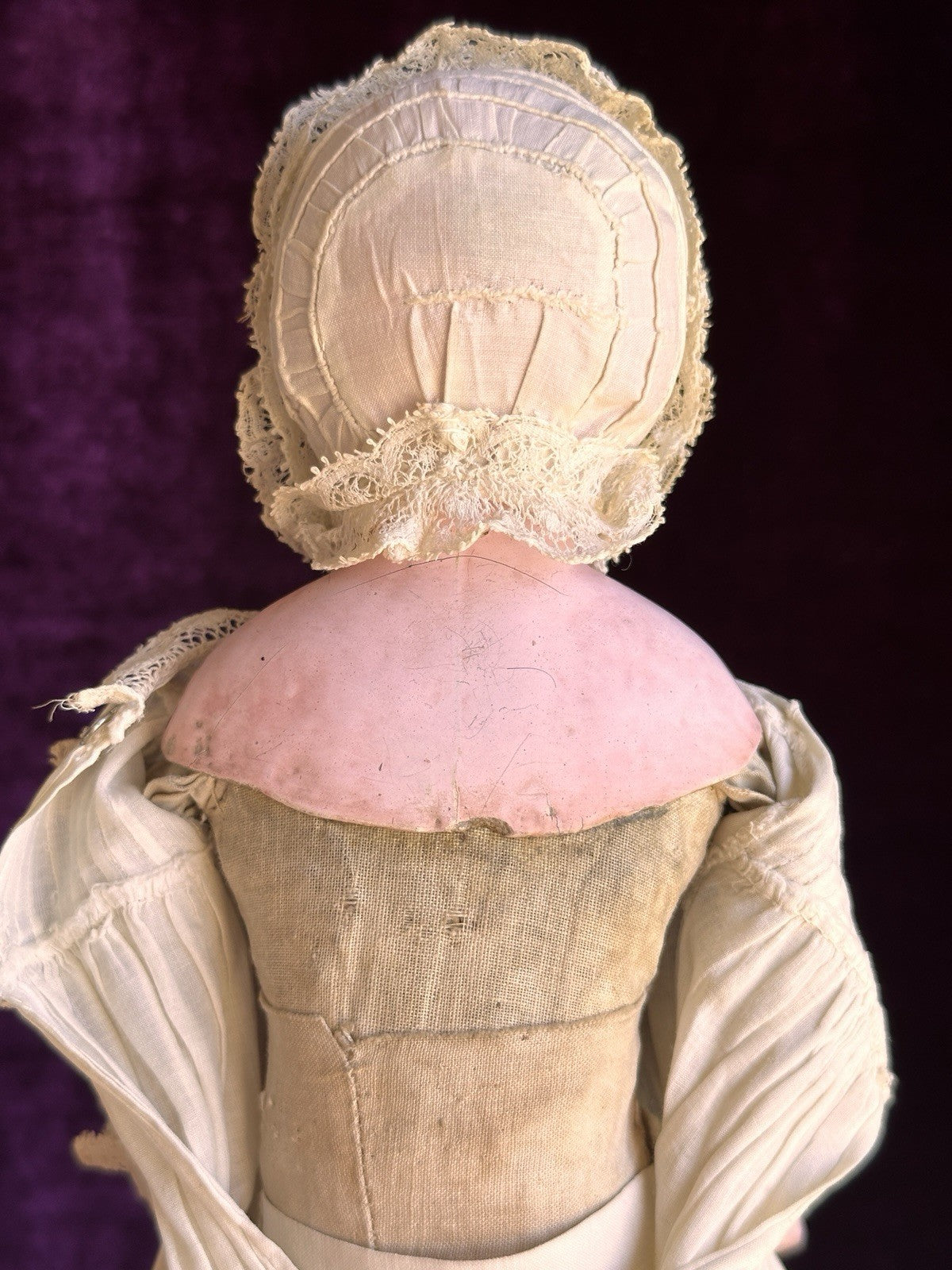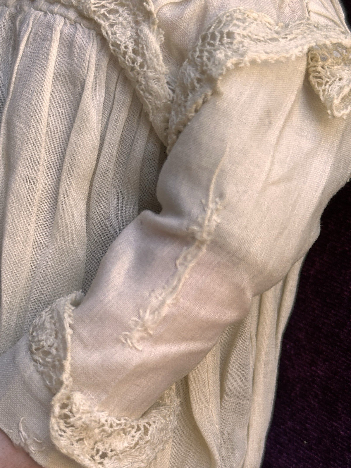 The doll is dressed in her original clothing, which shows age wear, including some repairs.