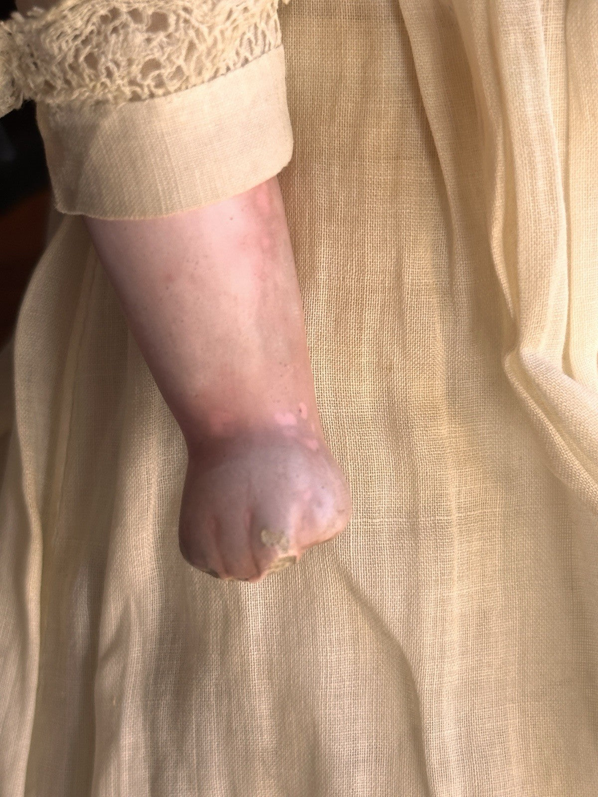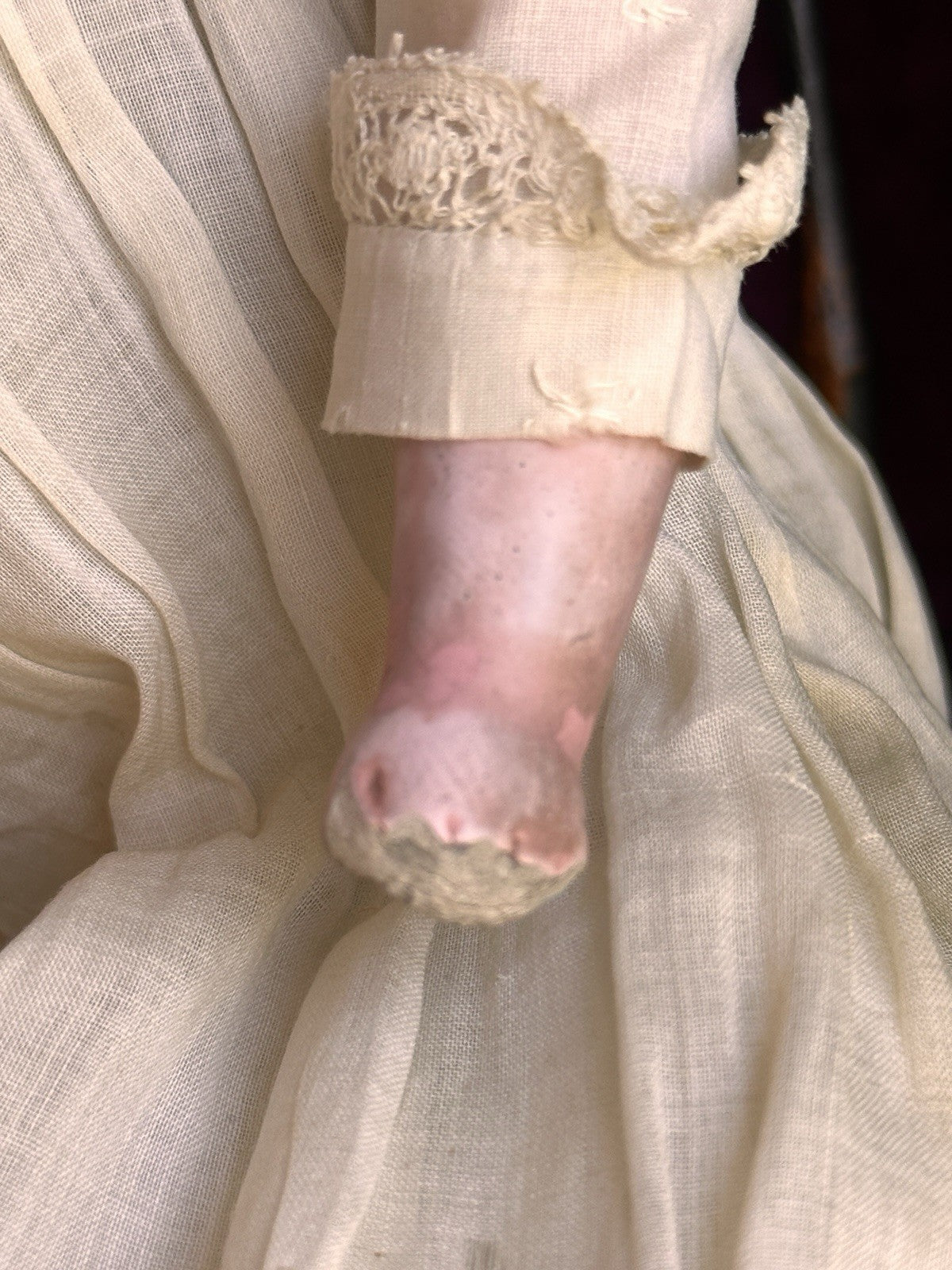 This cute old doll has sleepy eyes that appear to be stuck and do not move. They might possibly be repaired. The wax coating is entirely gone, revealing the papier-mâché head material. The head shows some damage and wear.