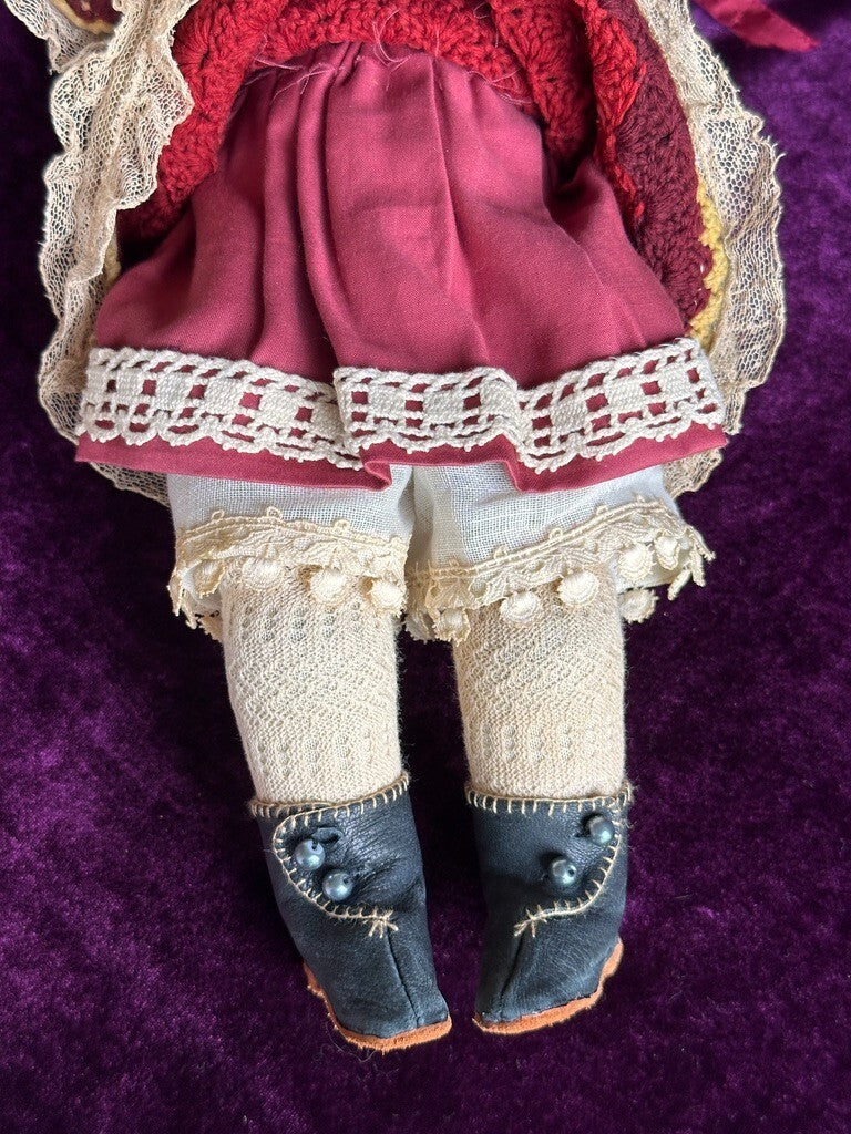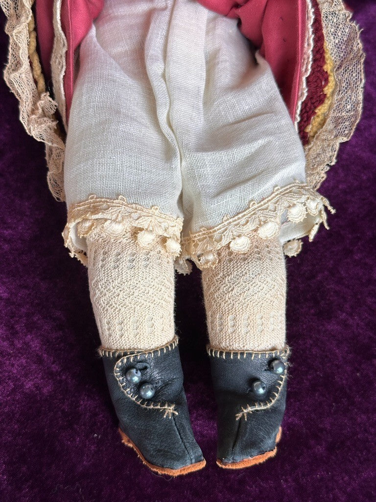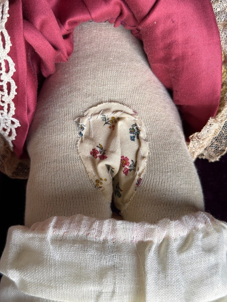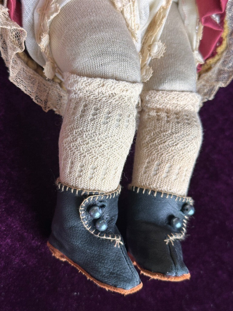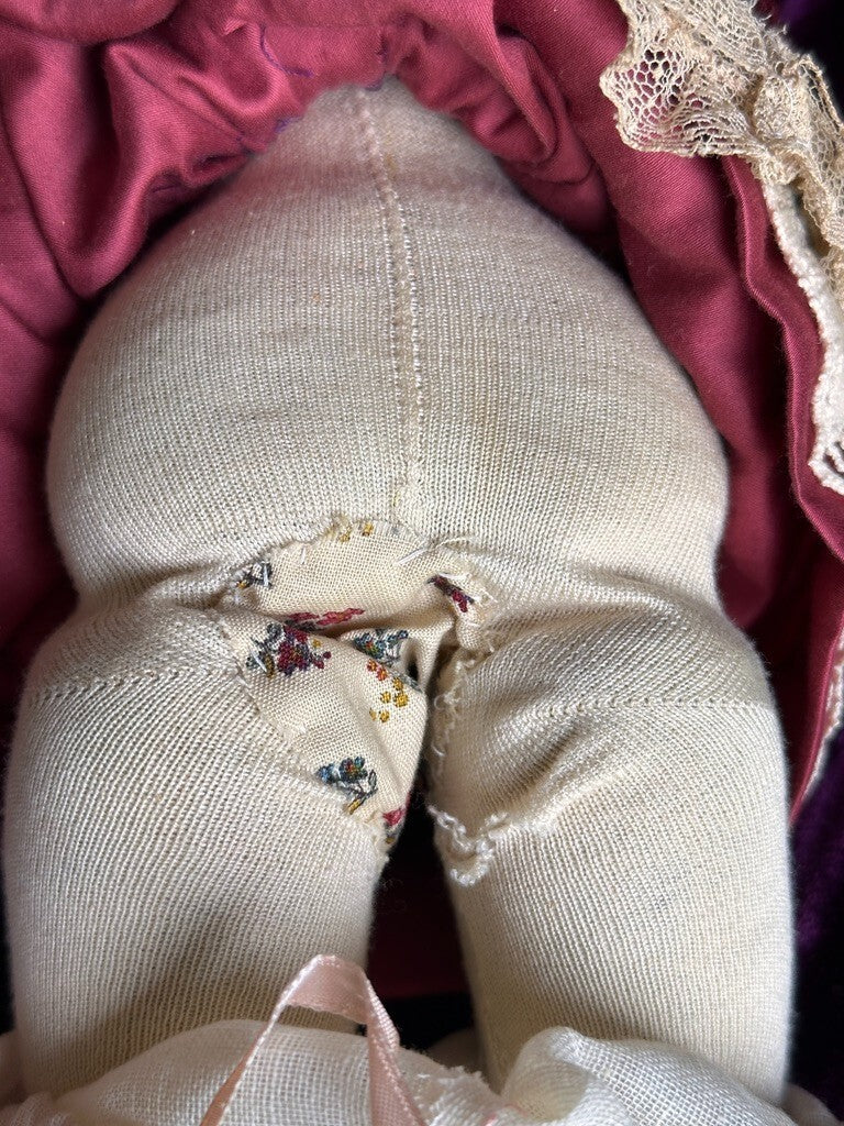 She is dressed in a very pretty handmade old dress, which fits tightly and was not removed to prevent damage. The body is covered in fabric that functions as sewn-on undergarments. It feels structurally sturdy, with no leaking noted , though some repairs may be present. The bisque lower hands each have a tiny chip.