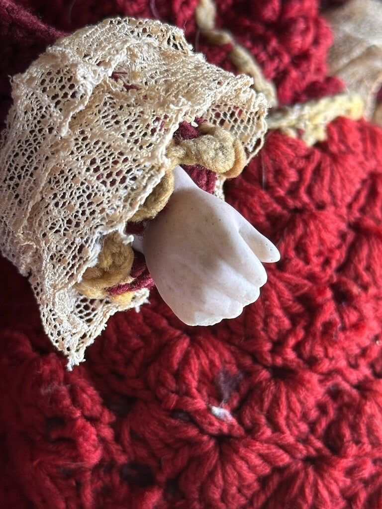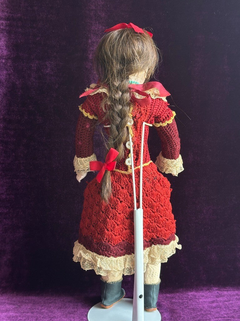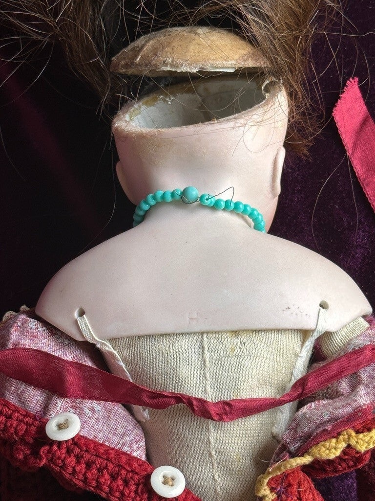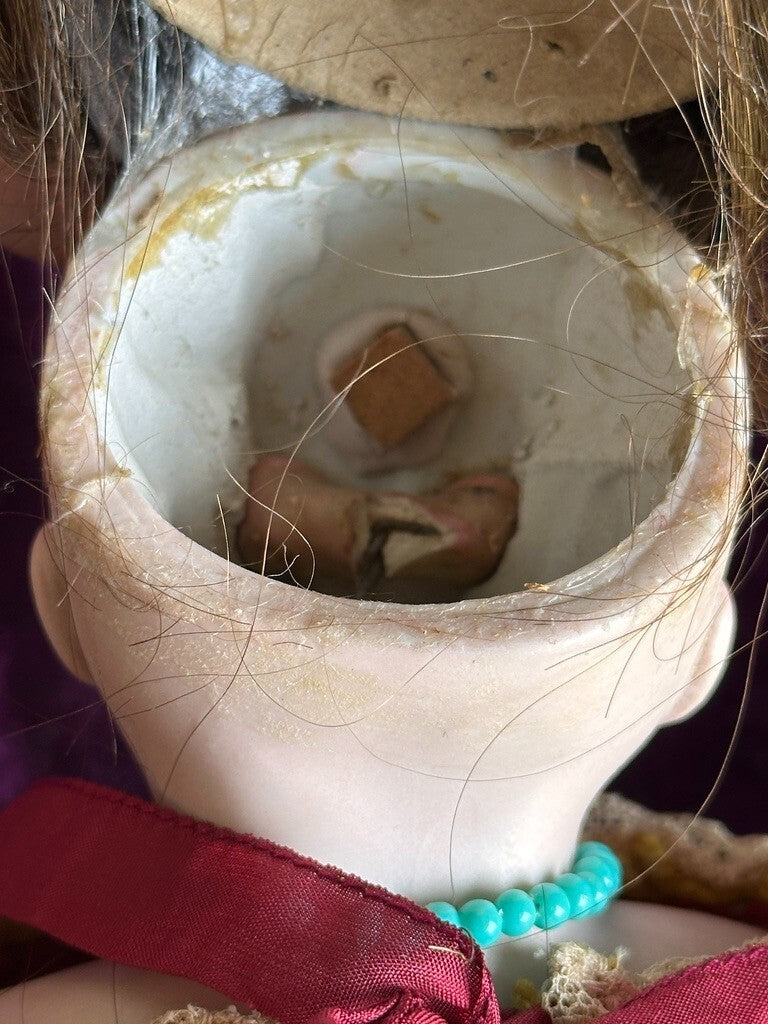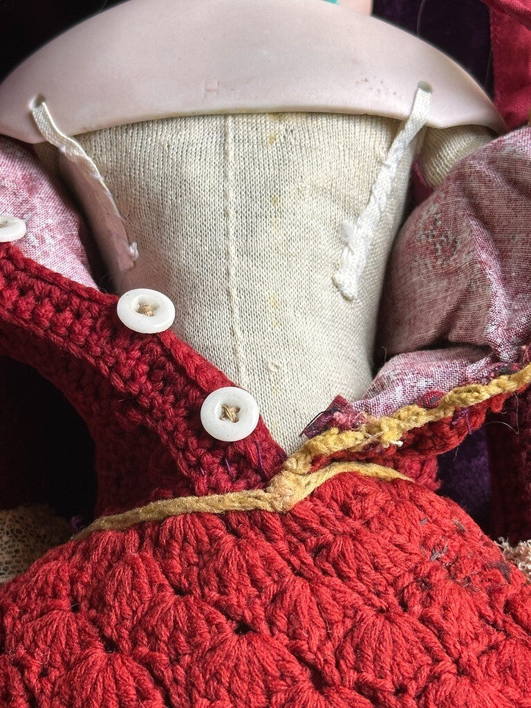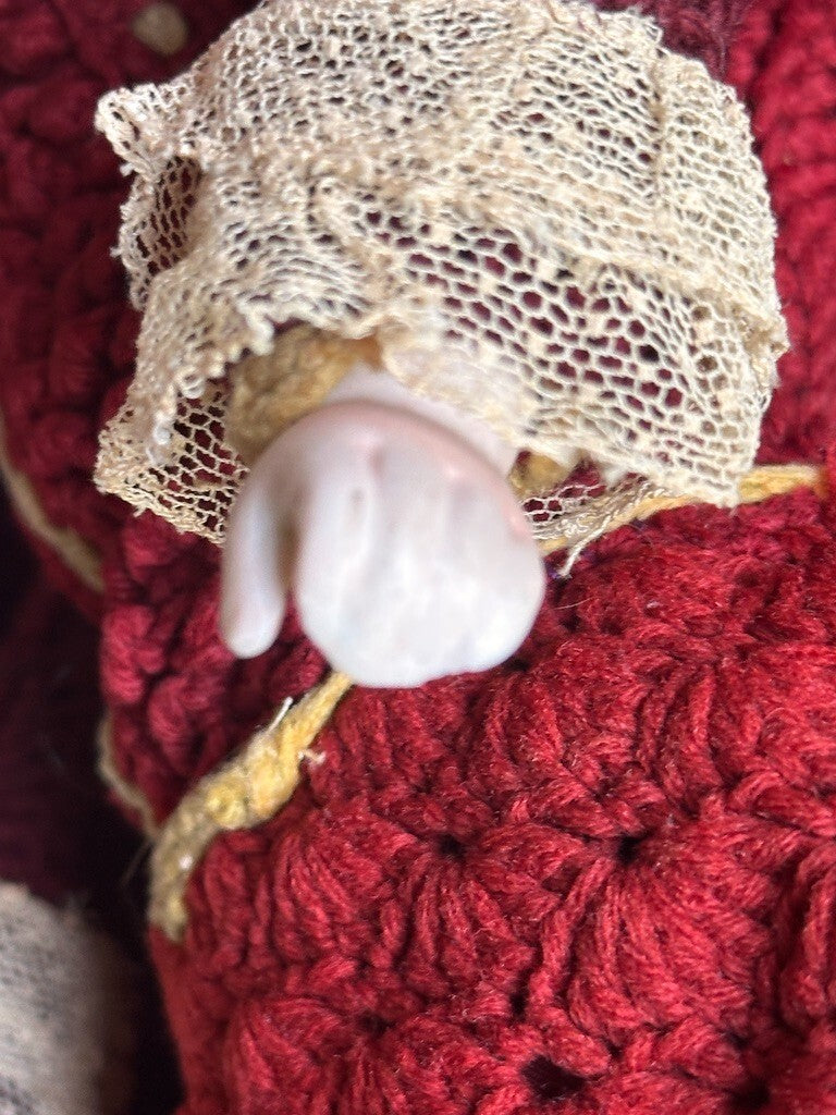 She is dressed in a very pretty handmade old dress, which fits tightly and was not removed to prevent damage. The body is covered in fabric that functions as sewn-on undergarments. It feels structurally sturdy, with no leaking noted , though some repairs may be present. The bisque lower hands each have a tiny chip.