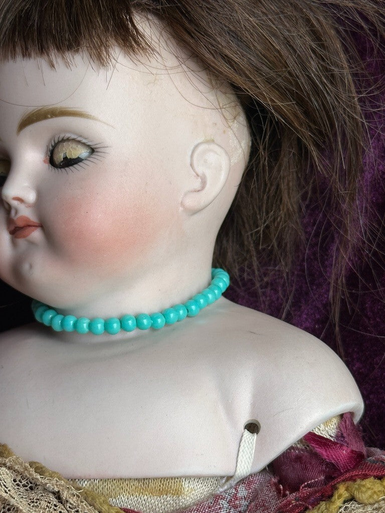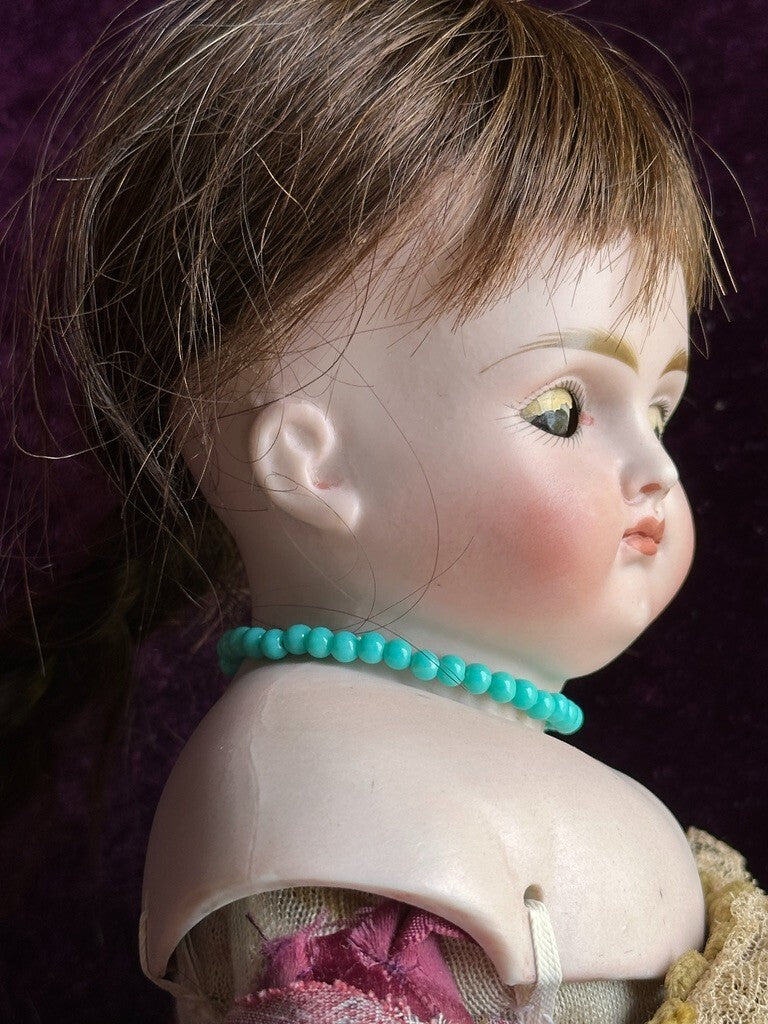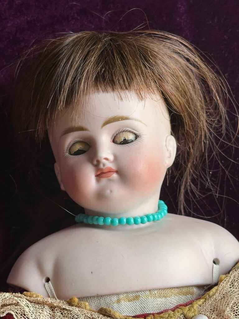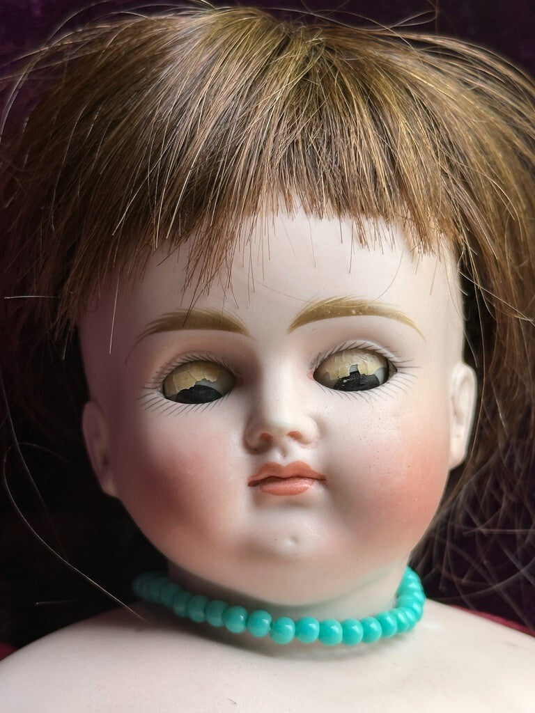 This is a beautiful example of an early Kestner alphabet series bisque head doll with a close mouth and turned head. She has working sleepy eyes with worn paint on the eyelids. The bisque head is free of damage and retains its original plaster pate. The doll is wearing a human hair wig.