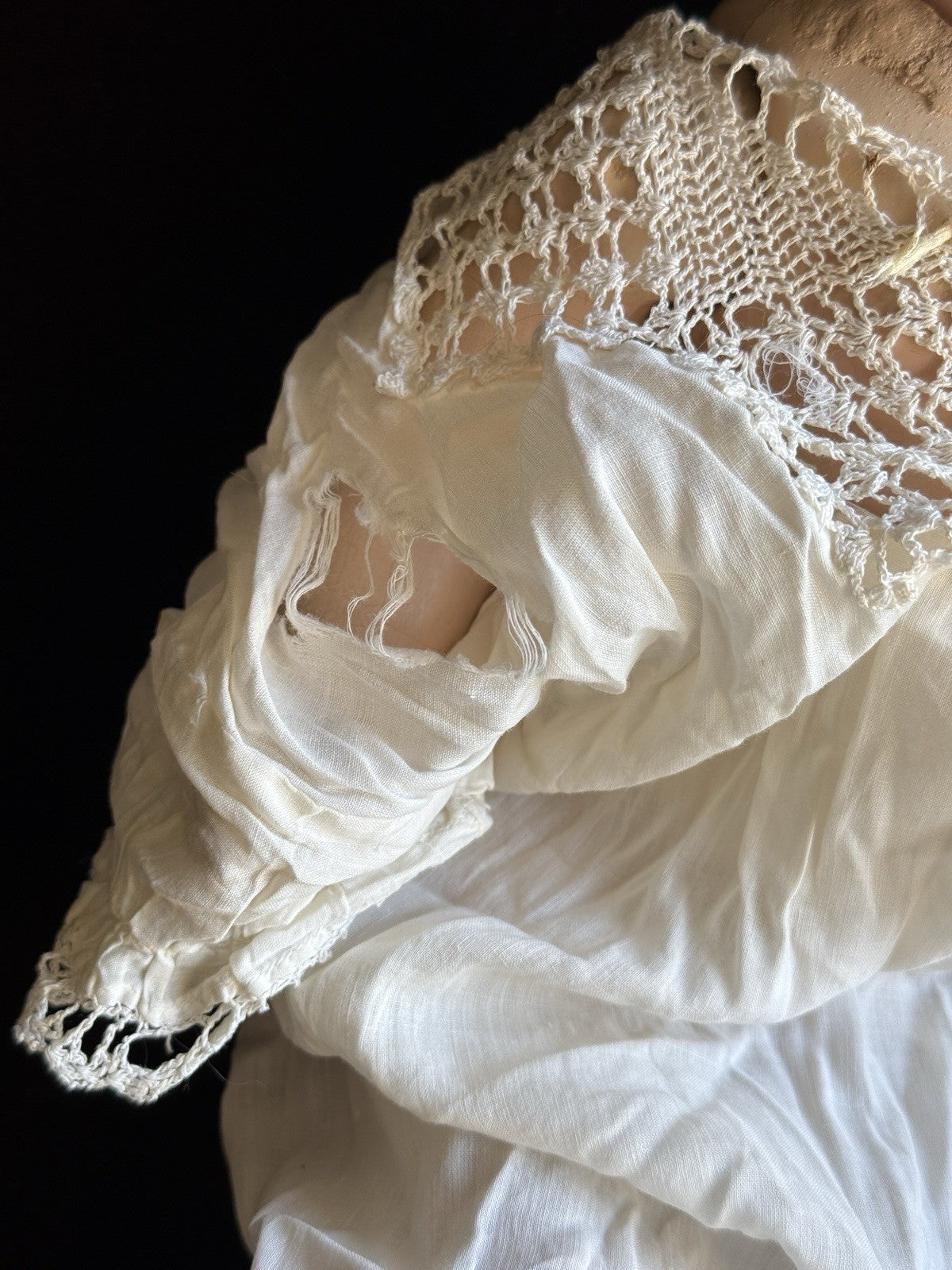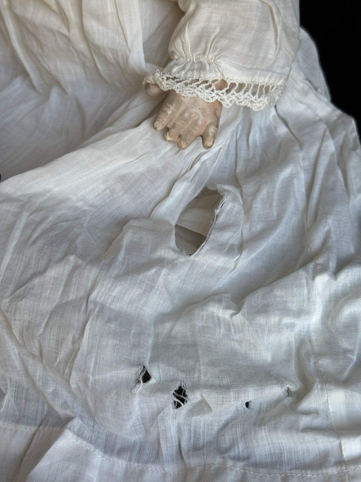 Adorable doll with working sleepy eyes. There is light wear to the paint on the eyelids. The bisque is in good condition with no damage. There are some hair, wig and glue residues on the head. The original wig is in good condition. The body shows damage, repairs and wear visible in the photos. Stringing is loose. The doll comes dressed as shown. Holes and tears to the gown and underdress.