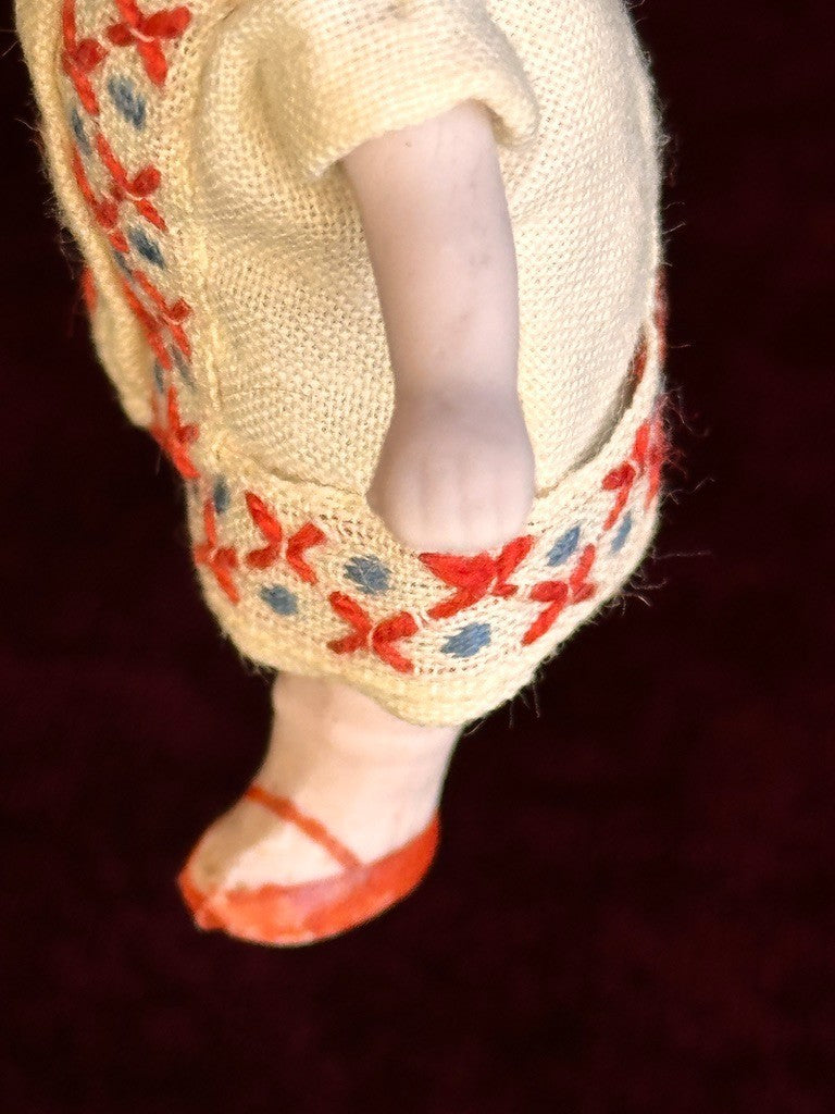 Here is an adorable tiny character doll. The doll is most likely marked on the back, but the dress is not removable unless unstitched. The doll is coming with matching panties.