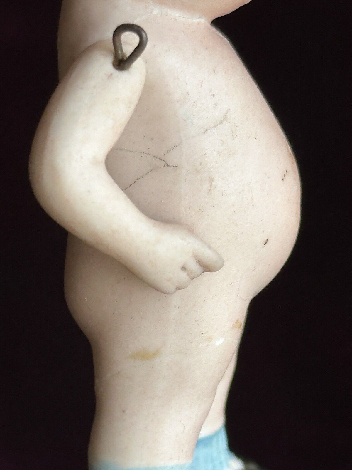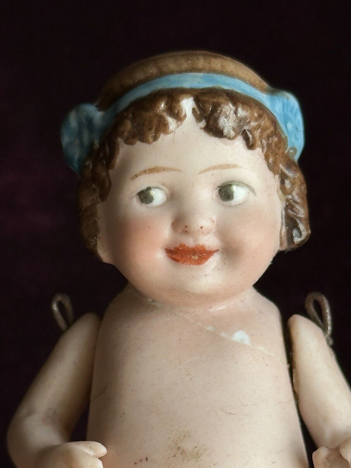 Adorable hard to find little doll! Unfortunately, the doll has damage and repairs. The damage can be seen on the photos. Please look through all the photos as they are an important part of the description. The head/torso and legs are one piece. The arms are jointed. Please refer to the pictures for more details. No stand to the doll.