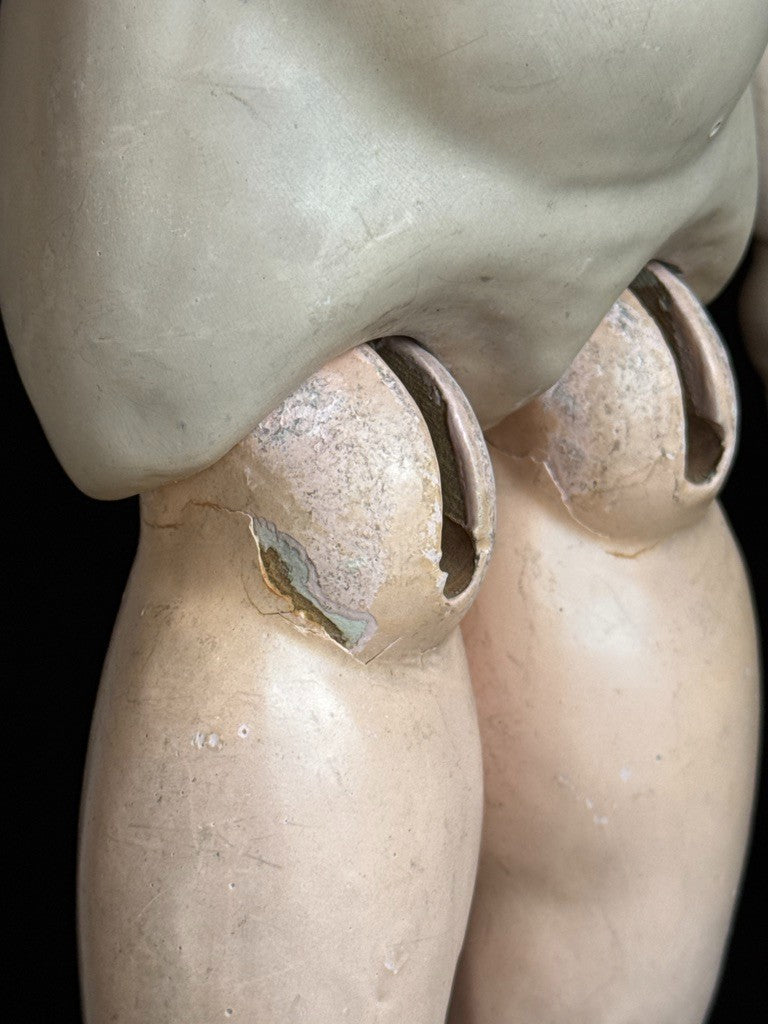 This beautiful doll has working sleepy eyes, though the eyelashes are almost entirely gone. The head is in great condition with no damage. The body is nicely preserved and shows some wear, visible in the photos. Stringing is good. She comes with an antique human hair wig that has damage at the back. The doll includes two-piece underwear. Her beautiful dress is most likely vintage and is in good condition. The matching hat shows light wear, including some stains.