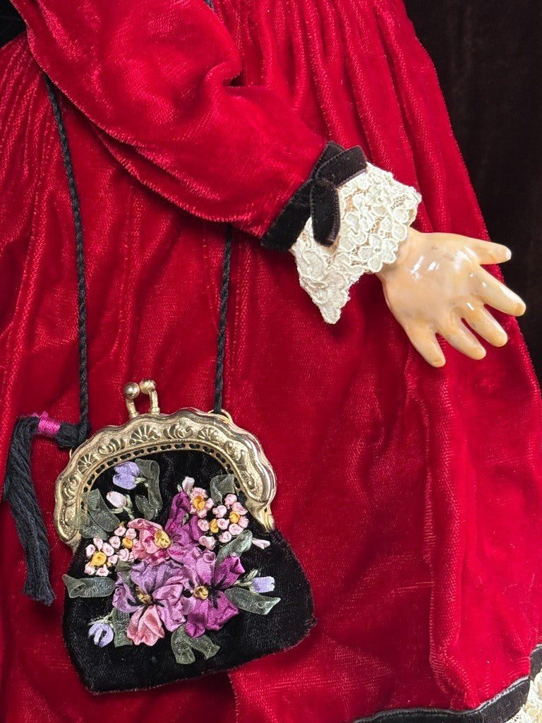 This pretty doll has working sleepy eyes with eyelashes. The eyelids appear to have been repainted. The bisque has two small production defects at the rim of the head but no damage. There are hair and glue residues on the head. The body is in overall good condition with possible repaint and good stringing. She is dressed as shown and comes with a beautifully made purse.