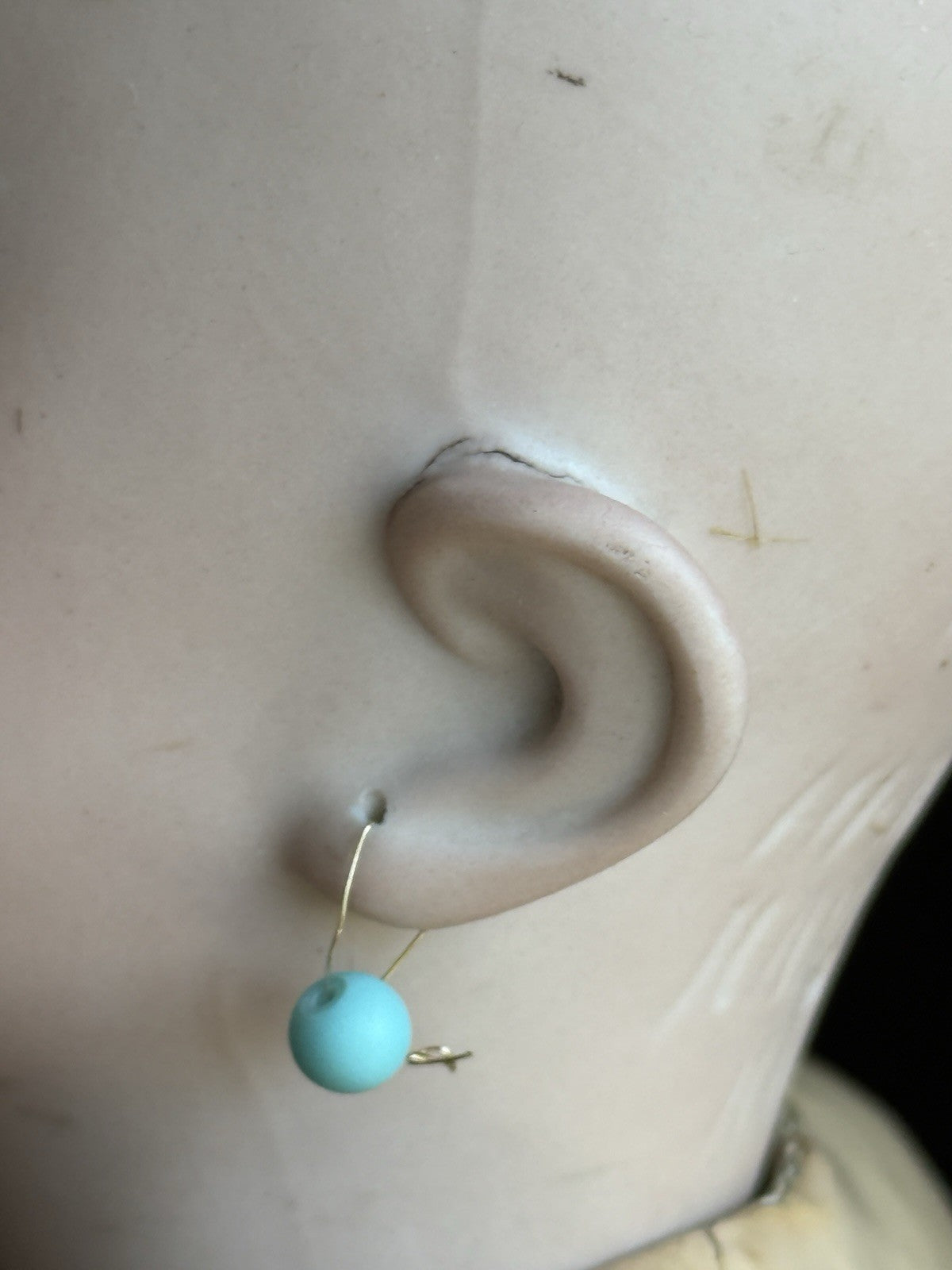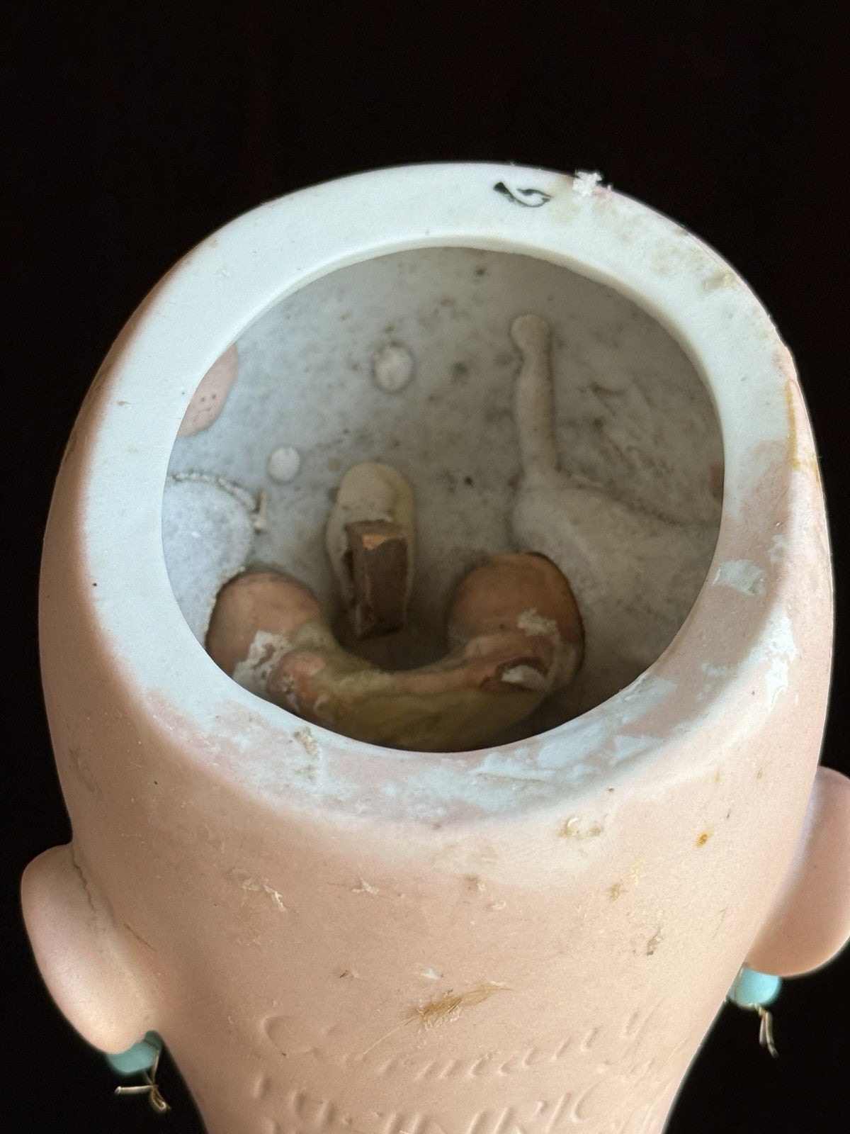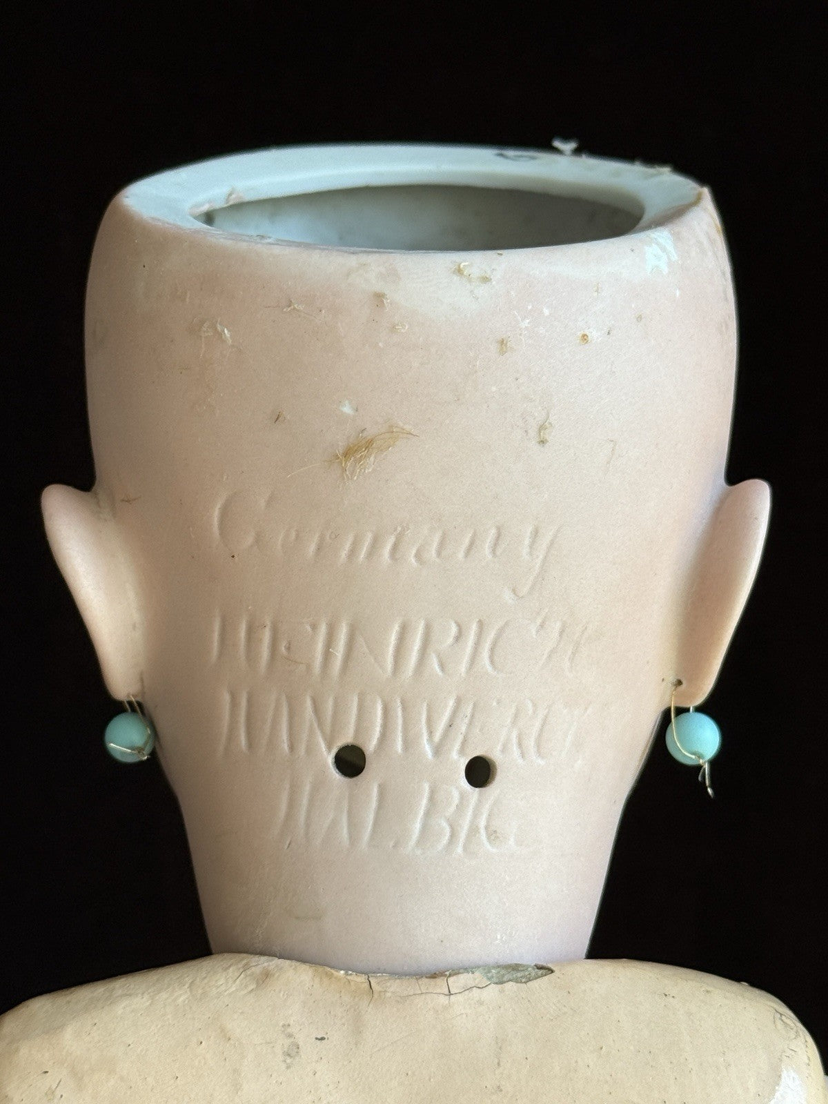 This pretty girl has working sleepy eyes. Her bisque is in very good condition with no hairlines, cracks, or chips. There are some small wig pulls to the bisque, as well as a production kiln crack behind the left ear.