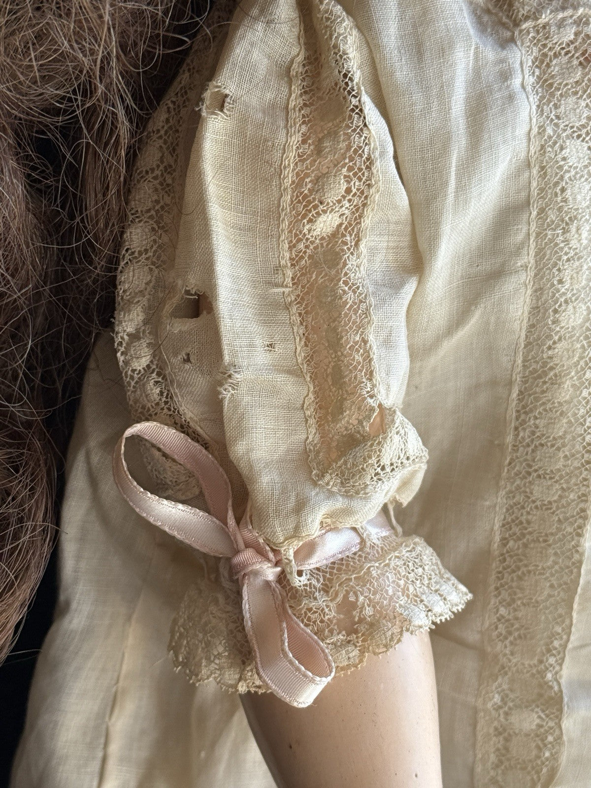 The doll is dressed as shown. Her shoes are vintage replacements. Both the underdress and dress have some holes and tears.