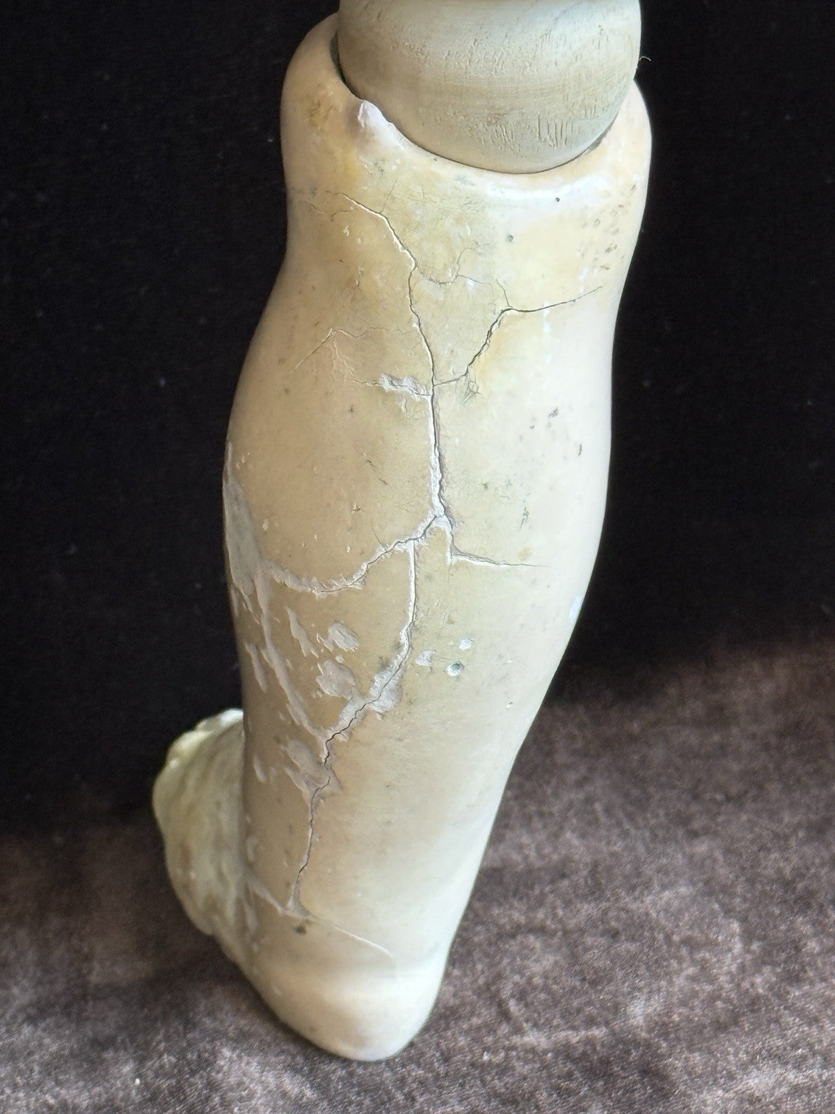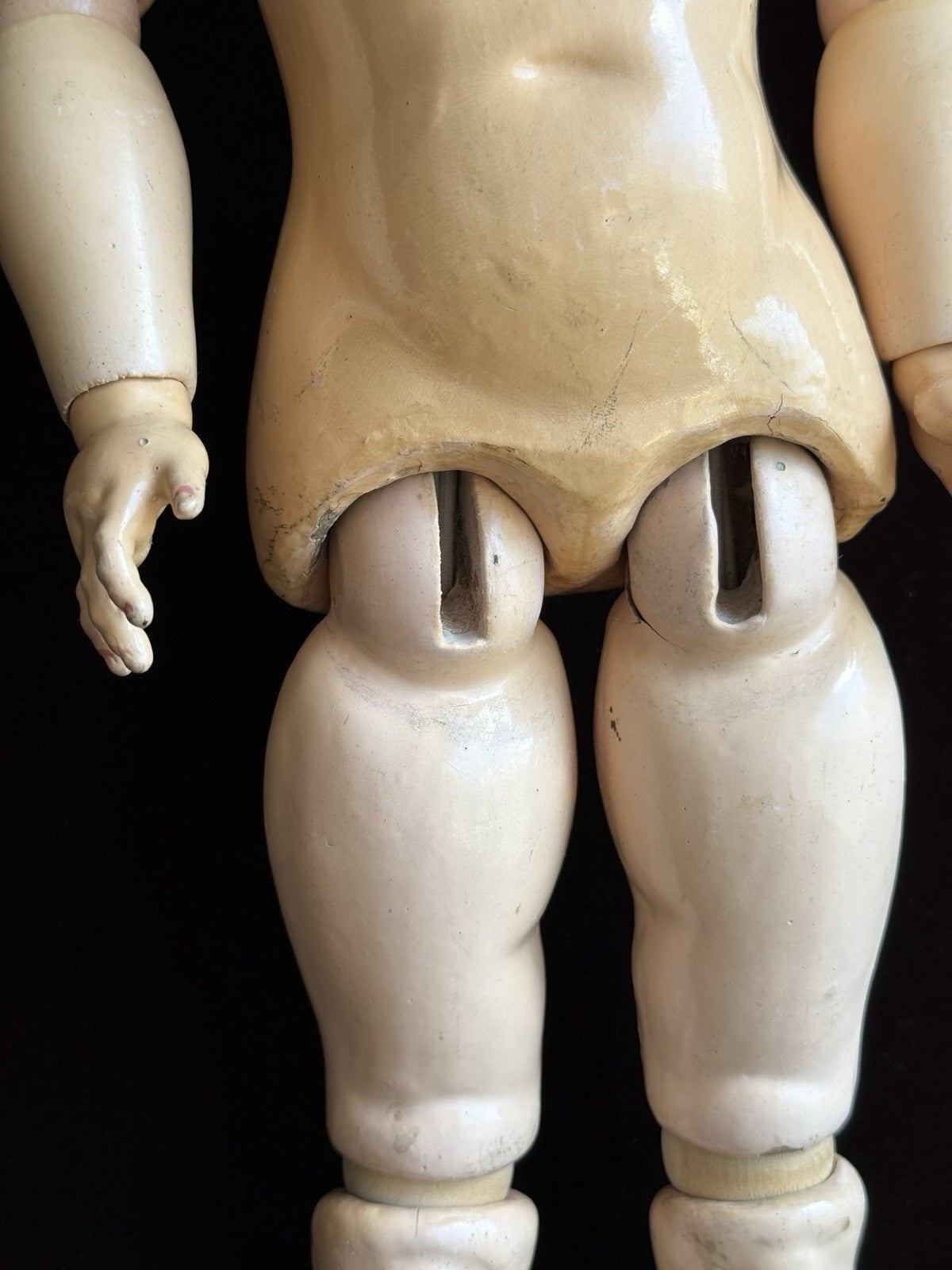 The wig is a vintage replacement and comes with a replaced pate. The body is in overall good condition; however, there is heavy wear to the lower left leg. Additional flaws to the body are shown in the photos. Stringing is not 100% tight but is not loose.