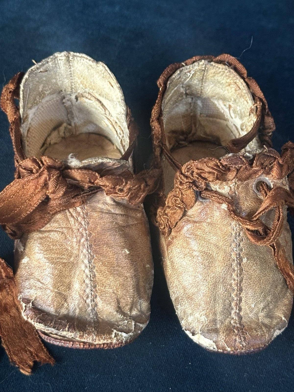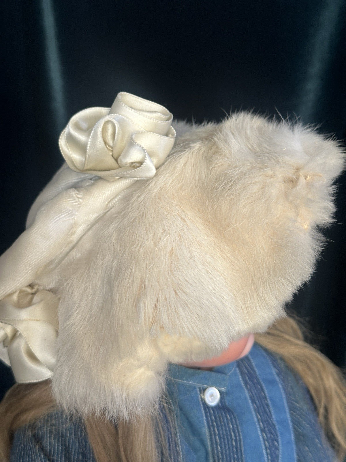 Her outfit is new a combination of antique (shoes, hat), vintage (dress and coat type dress) and new (socks). Beautiful antique shoes are in fair shape; real rabbit fur to her hat (shedding.) Stains and holes are present. Stand is not included.