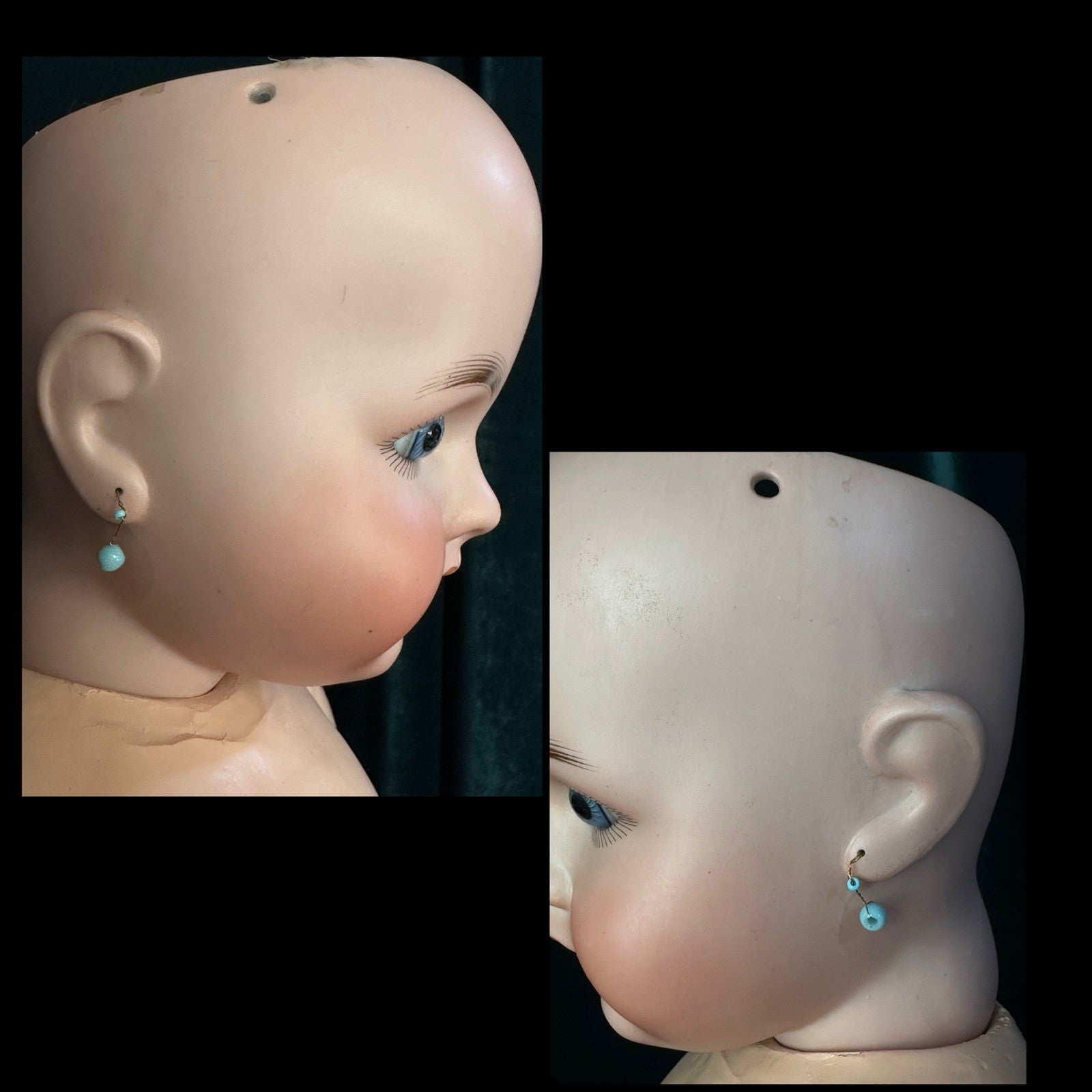 Bisque socket head, blue glass stationary eyes. Small hairline to the side of the bisque head. Painted lower and upper lashes. Open mouth with teeth. Her wig is a real human ; big to her head. Pierced ears with new earrings.