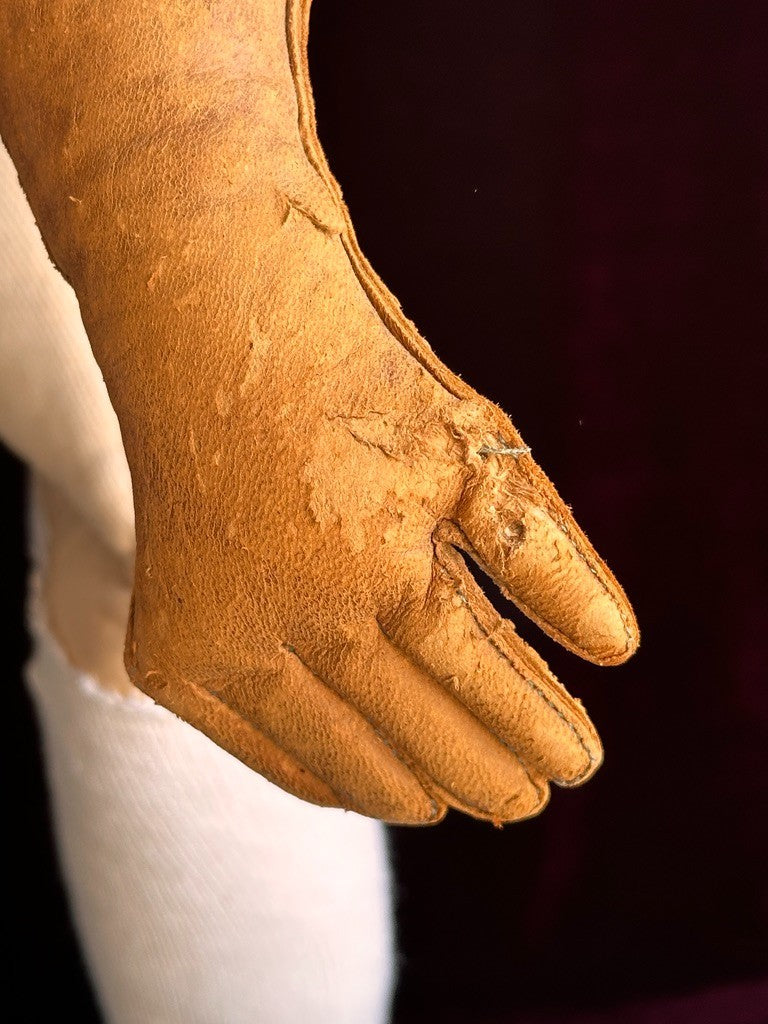 She is wearing two-piece underwear and an antique dress that has discoloration, small holes, and small stains. Antique shoes are included.