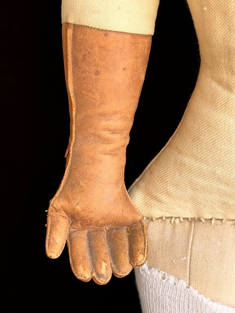 The shoulder head is attached to an old body that is possibly not original to the doll, but it is in very good condition. There is light wear and some signs of wear to her hands. The body is tightly stuffed and the doll is quite heavy.