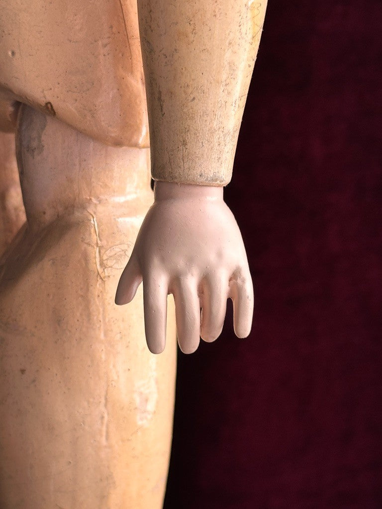 The shoes and socks were not removed to prevent any damage, as they fit the doll very tightly. The composition body shows typical light wear. The hands are repainted. Good stringing to the doll. The boy is beautifully dressed as shown.