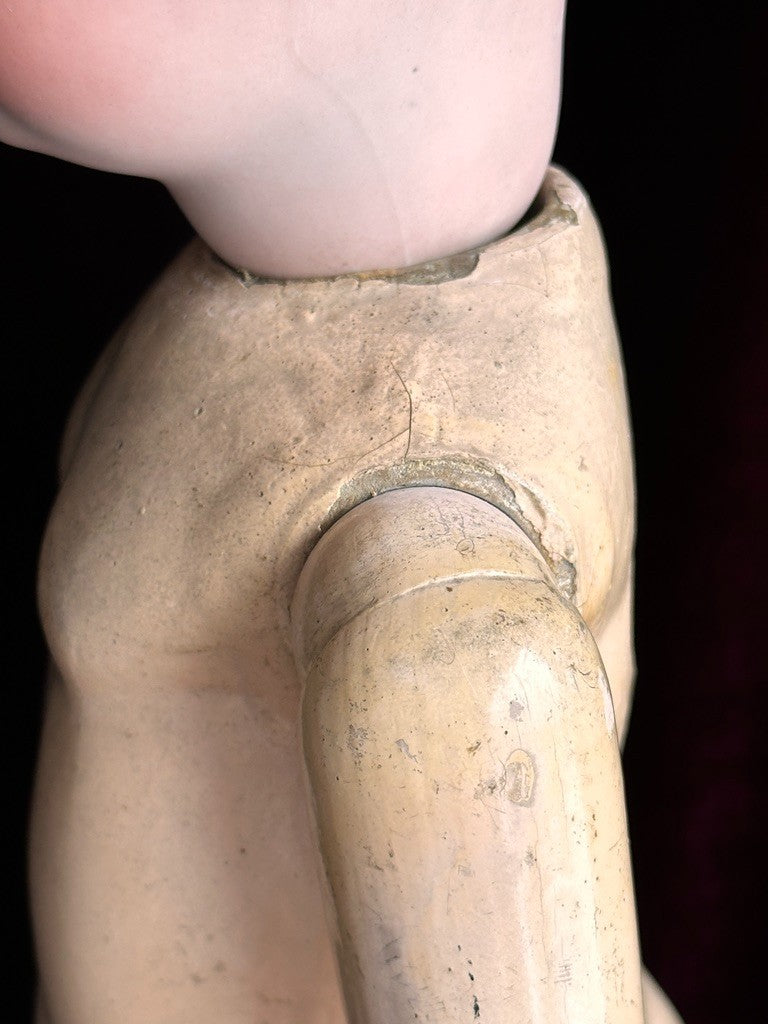 Very beautiful boy with working sleepy eyes. The wig is original and was a little unglued at the back, so the head was stuffed with tissue paper for protection. The bisque has no damage, no cracks, chips, or hairlines. The eyelashes are a little worn.