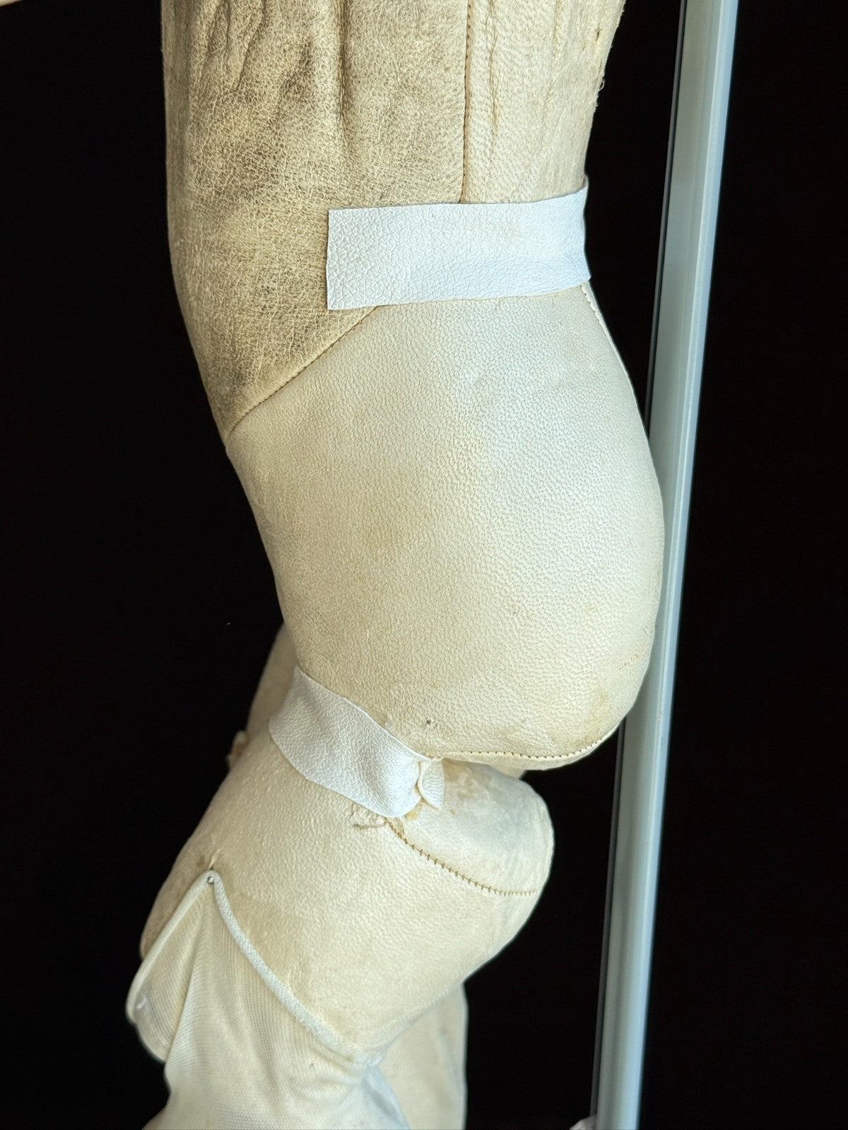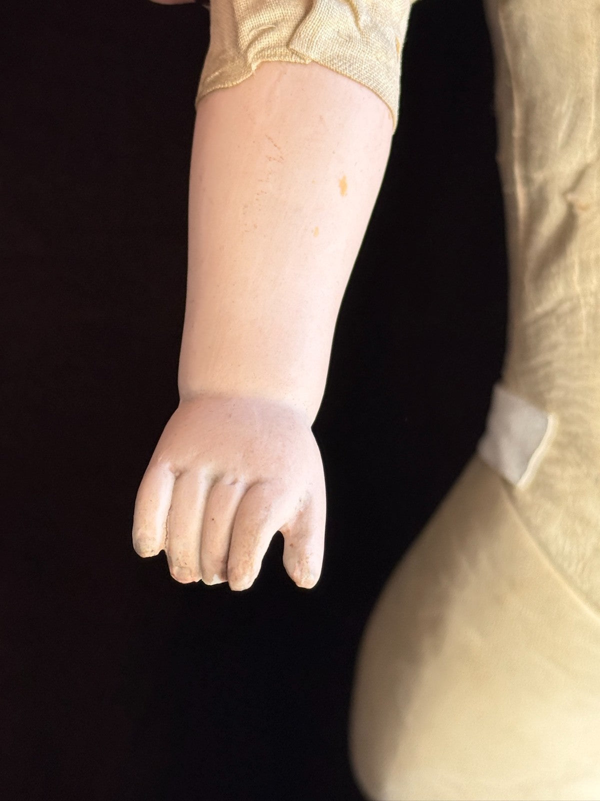 The body shows a few repairs to the leather; however, there is no leaking at this time. The stockings are attached to the legs and were not removed for full inspection. From what is visible, the lower legs appear to be in good shape, though there may be some old repairs as well. The upper, closed portions of the arms appear to be replacements. The original lower bisque arms are in good condition with just small production flaws, including a possible small chip to one of the fingers on the right hand.
