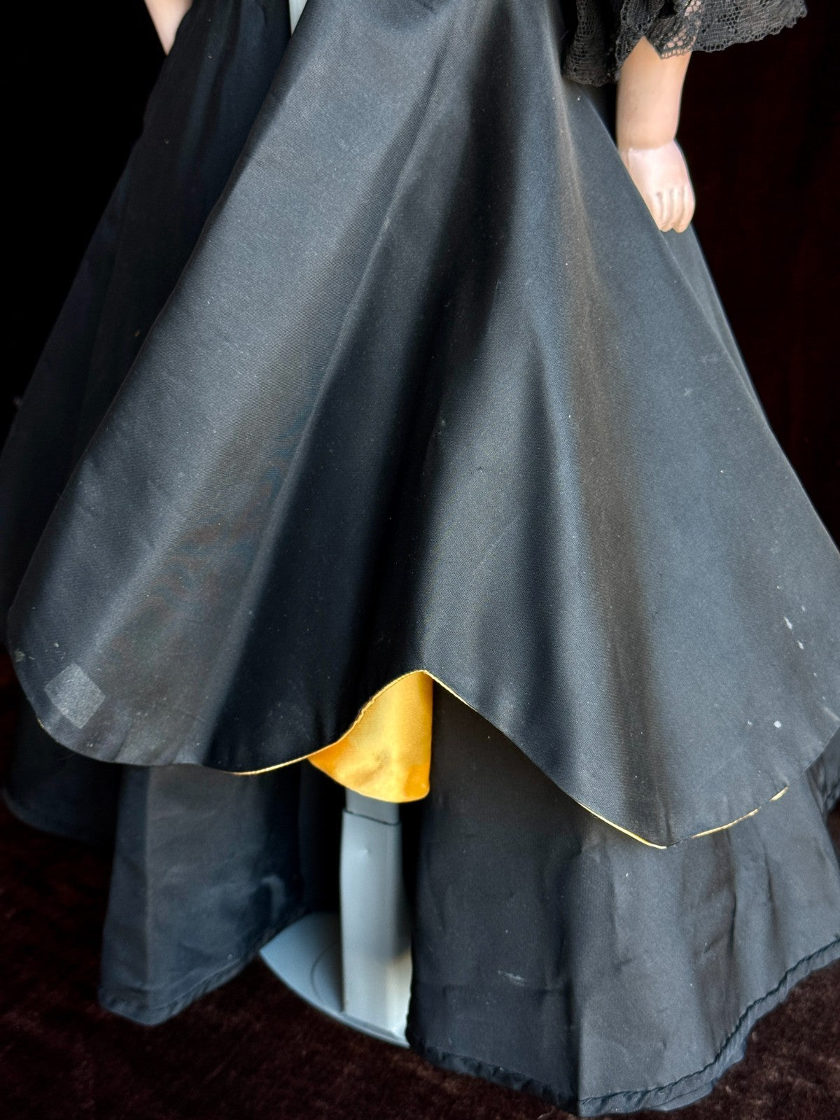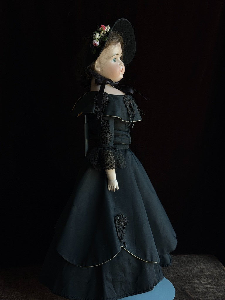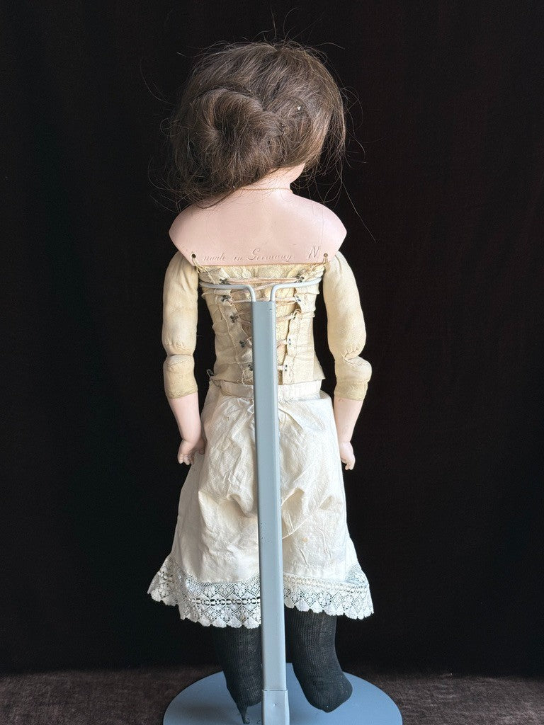 The doll is beautifully dressed. The outfit appears to be vintage and shows some imperfections, but it still displays very nicely. A beautiful handmade bonnet is included. The doll is coming with three-piece underwear, including a corset. Please refer to the photos, as they are an important part of the description and show all details and wear.