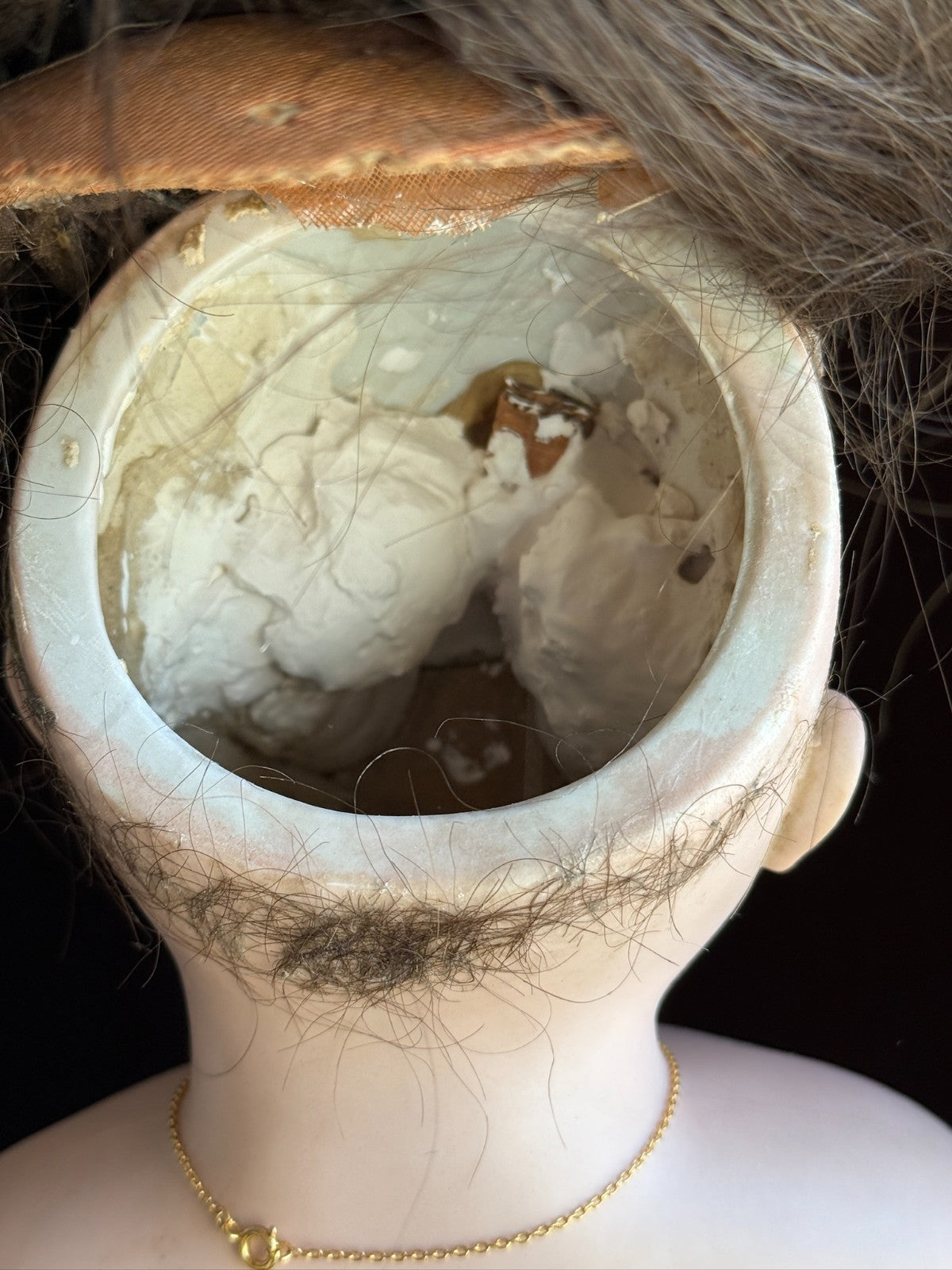This beautiful creation came to us with some signs of age-related wear. Her eyes were reset and are now stationary. The bisque is in great condition with no hairlines, cracks, or chips. There are some hair and glue residues to the bisque. The wig is partially glued on. The wig appears to be human hair and is most likely a replacement.