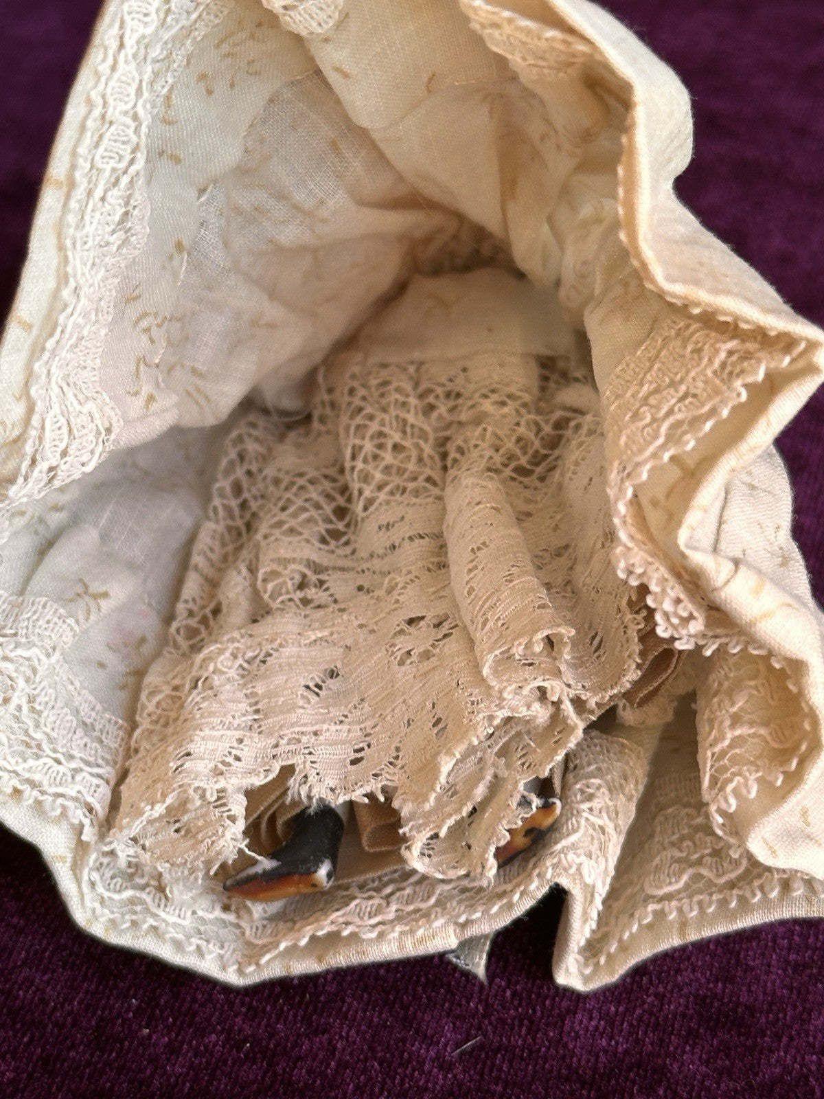 Hard to find in this size gorgeous doll! She has a china shoulder head and china lower legs and arms. Her antique body is filled with sawdust. The doll has no damage, no leaking. The lower legs show some paint imperfections and glue residue. She is dressed as shown. The clothes seem to be original.