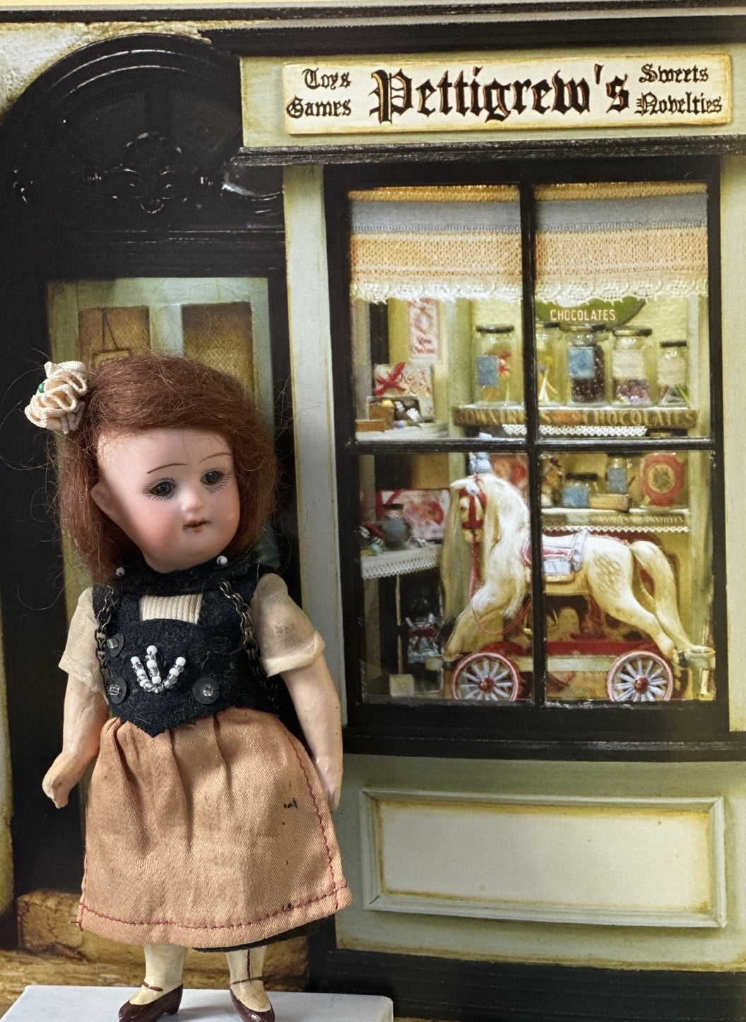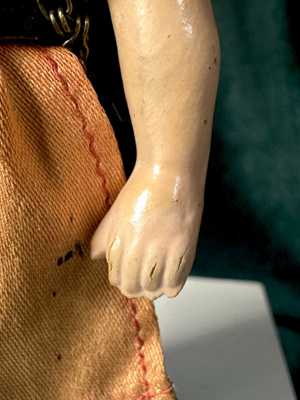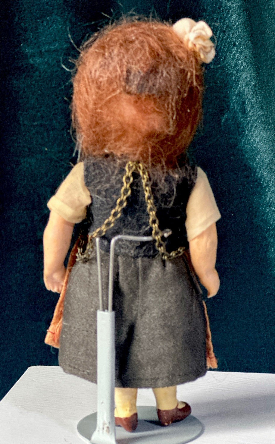 Sweet mignonette doll. Most likely , created by German artist. We are unable to see any markings on the back of her head. Stationary eyes. She has a bisque head and composition like body. The doll is dressed as shown on the photos. Her clothes are not removable. Stand is not included. Please refer to the pictures for more details.