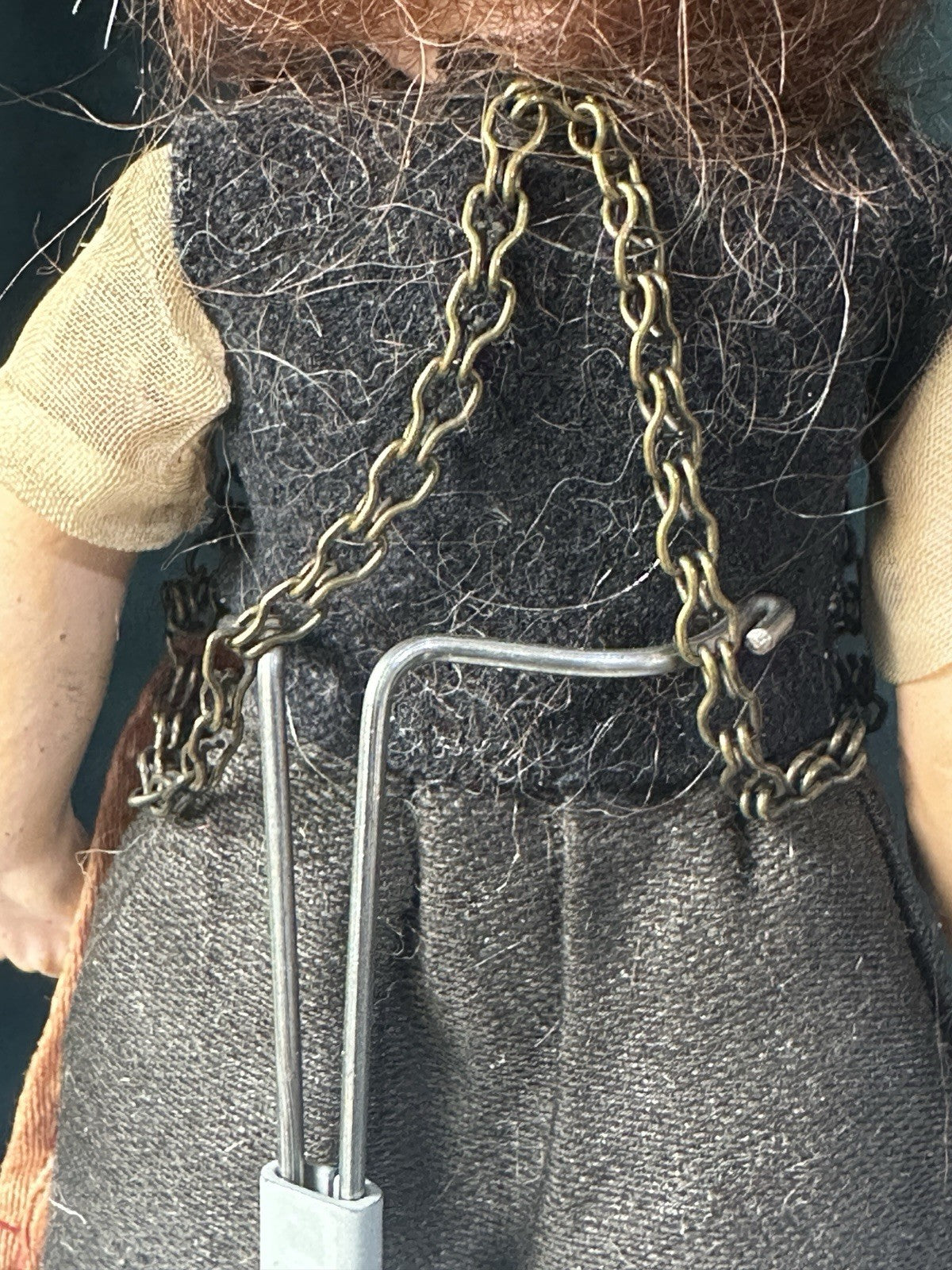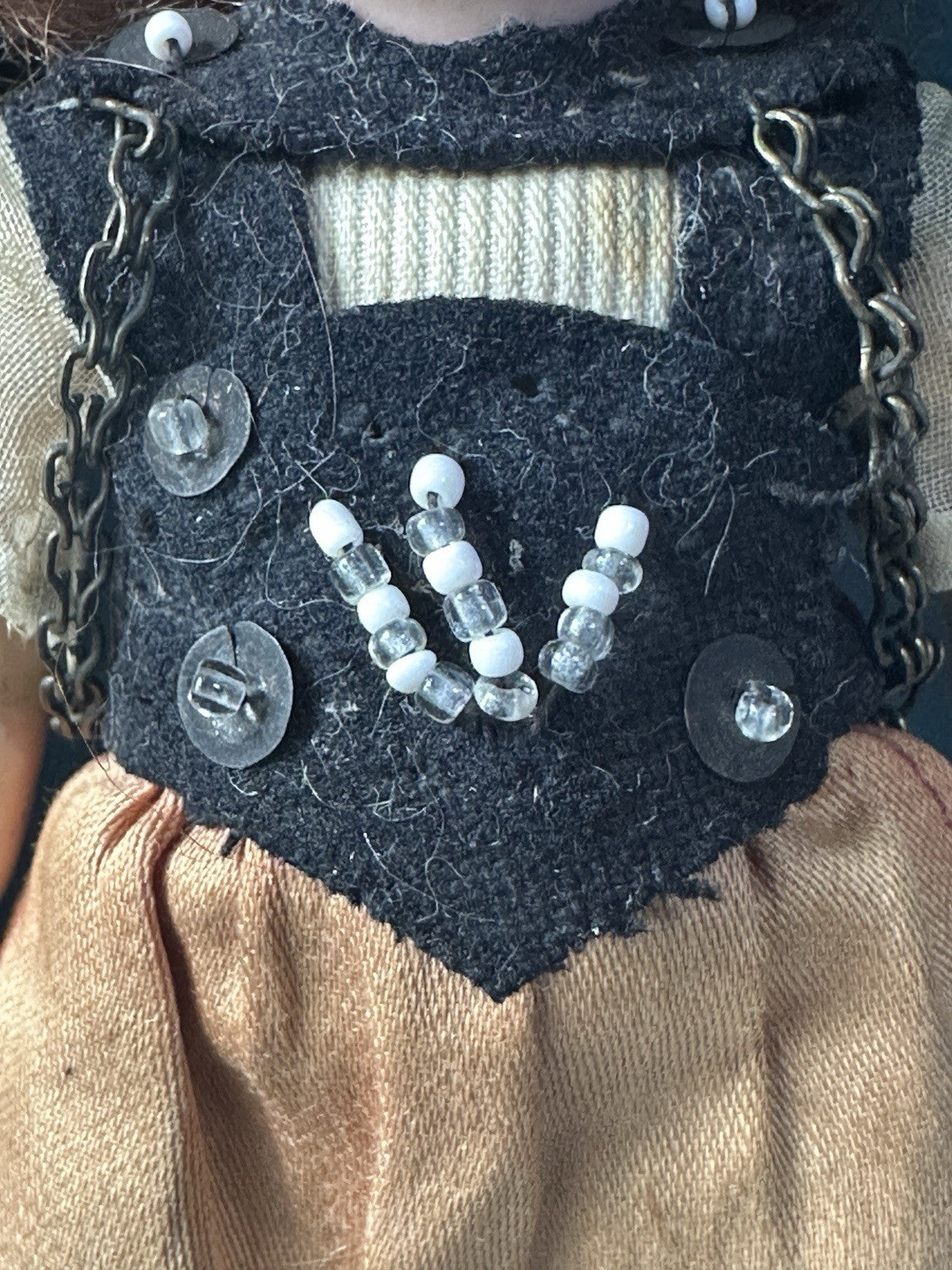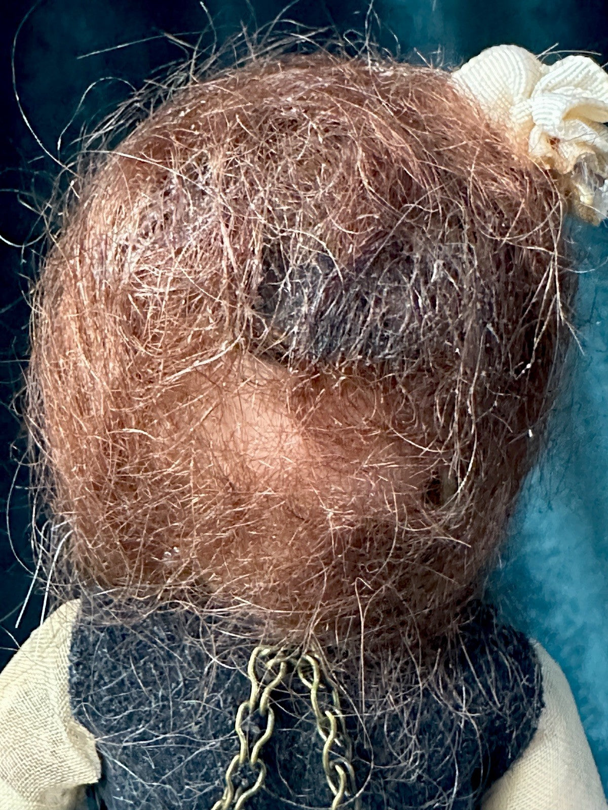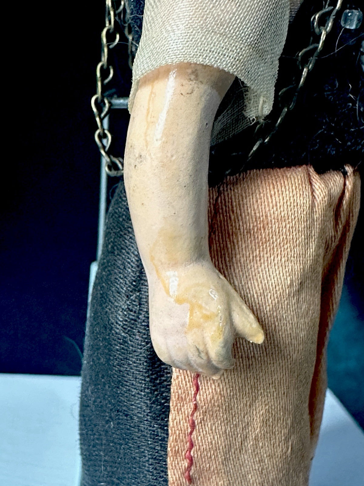 Sweet mignonette doll. Most likely , created by German artist. We are unable to see any markings on the back of her head. Stationary eyes. She has a bisque head and composition like body. The doll is dressed as shown on the photos. Her clothes are not removable. Stand is not included. Please refer to the pictures for more details.