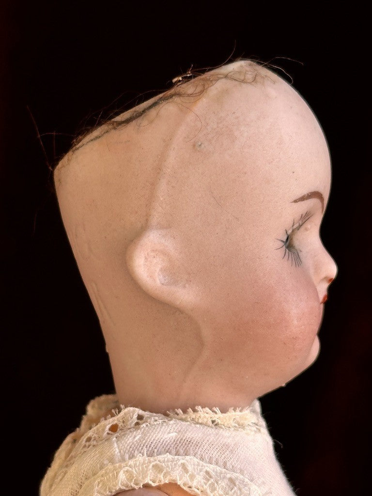 Here is an adorable little doll with working sleepy eyes. The bisque is free of damage and has just some hair and glue residues, along with a few small production defects to the head.