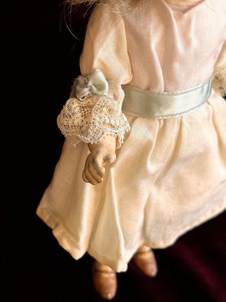 The underwear of the doll was not removed because it would need to be unstitched. The body shows just light paint wear. The legs and arms are not jointed; they are one-piece limbs.