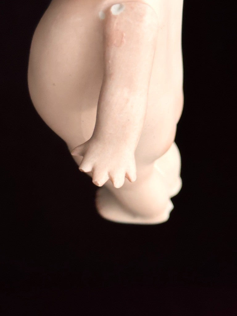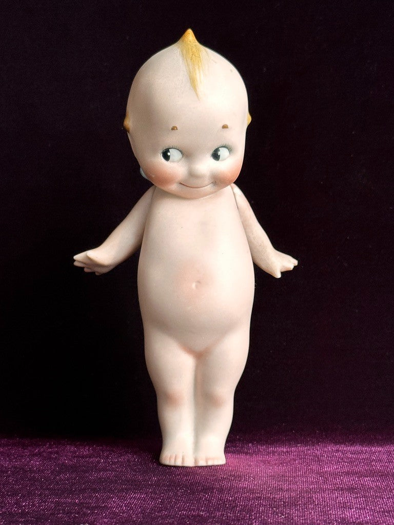 Very cute cute Kewpie doll in overall good condition with small imperfections. There is a flake to the torso on the left side by the hole and a small chip to the left arm. There may be small chips to some of the fingers on the left hand. The doll has good stringing.