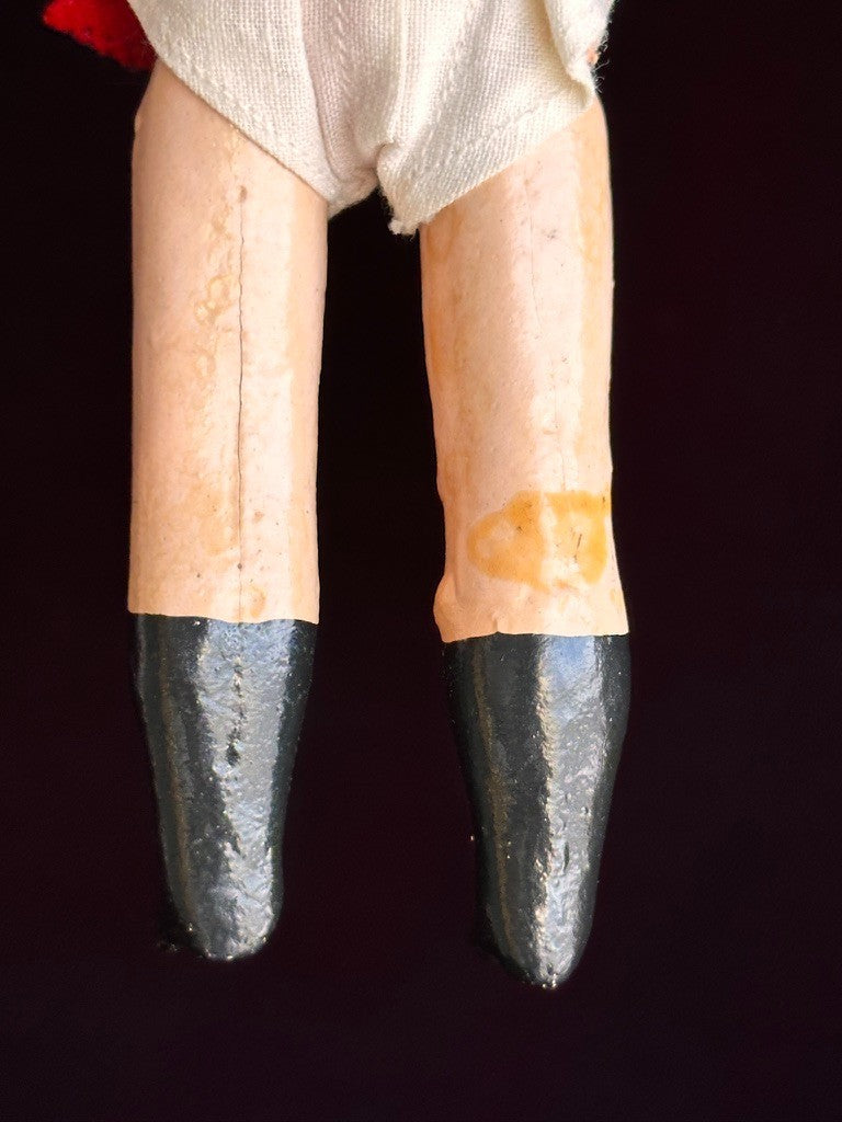 Here is a beautiful cabinet-size doll in original ethnic outfit. The doll has a bisque head and composition body, with straight legs and arms. She has stationary eyes and the original wig. The doll is nicely preserved. The bisque is free of damage. The composition parts are also in good shape with just light cracks to the legs. The outfit shows light wear, including some discoloration, but overall is in good condition.