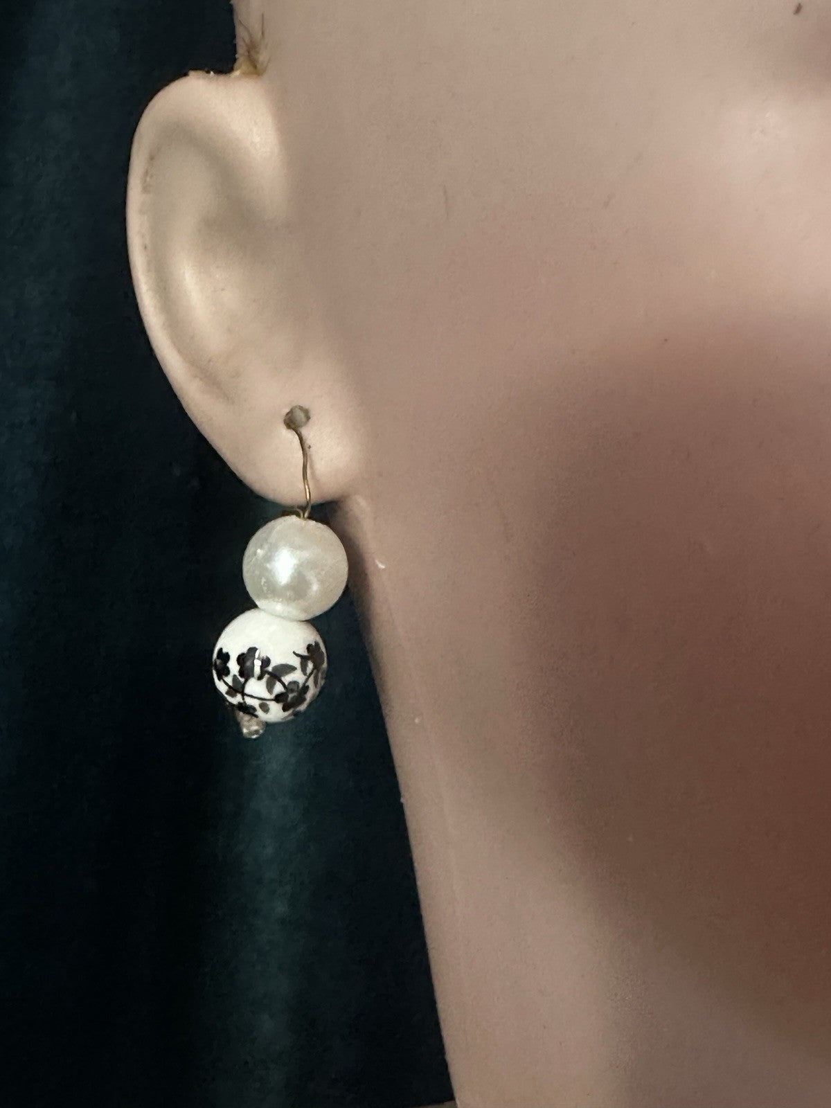 Bisque socket head, blue/grey glass sleepy eyes. No visible damage to the bisque head. Painted lower lashes and real upper lashes. Open mouth with teeth. Real human (?) hair antique wig; not attached to her head. Hair feels very dry. Pierced ears with new earrings.
