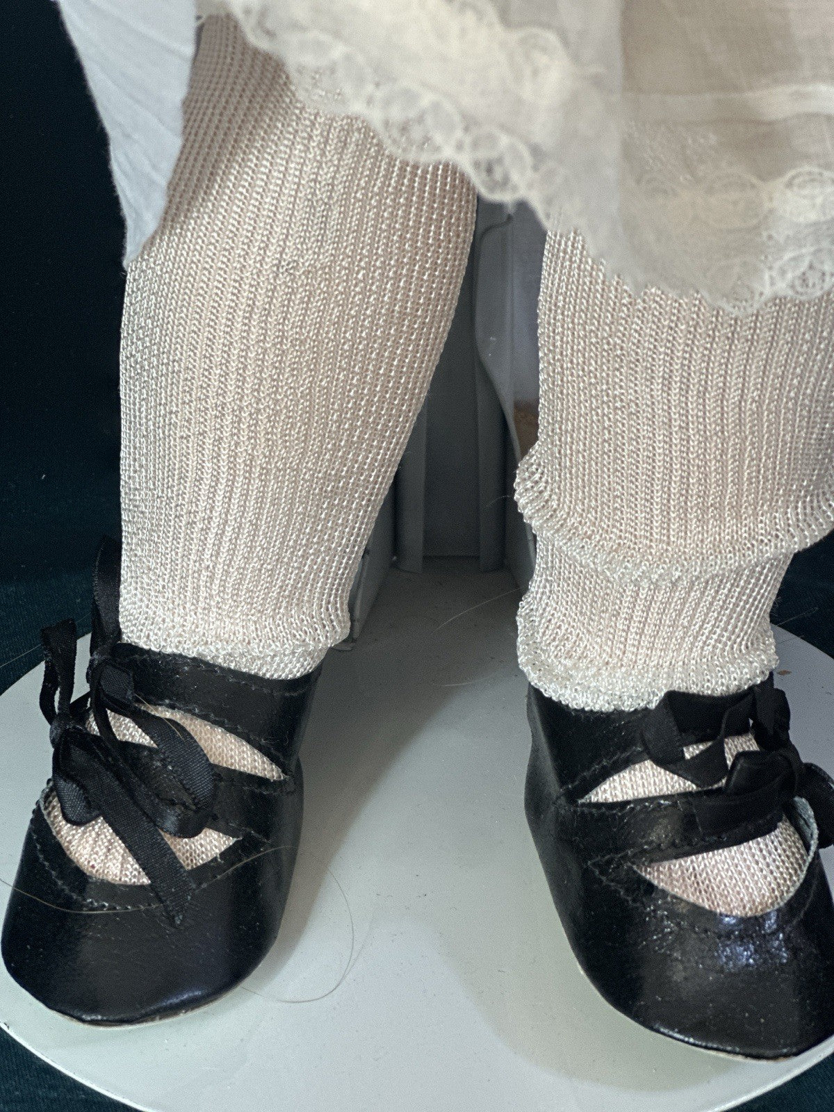 Her dress, pantaloons, shoes and socks are new or vintage. Stains and holes are present.