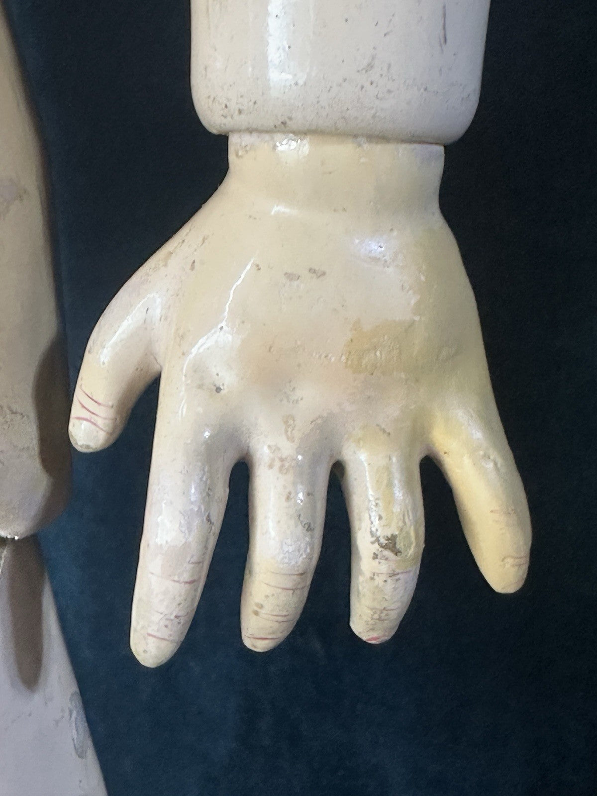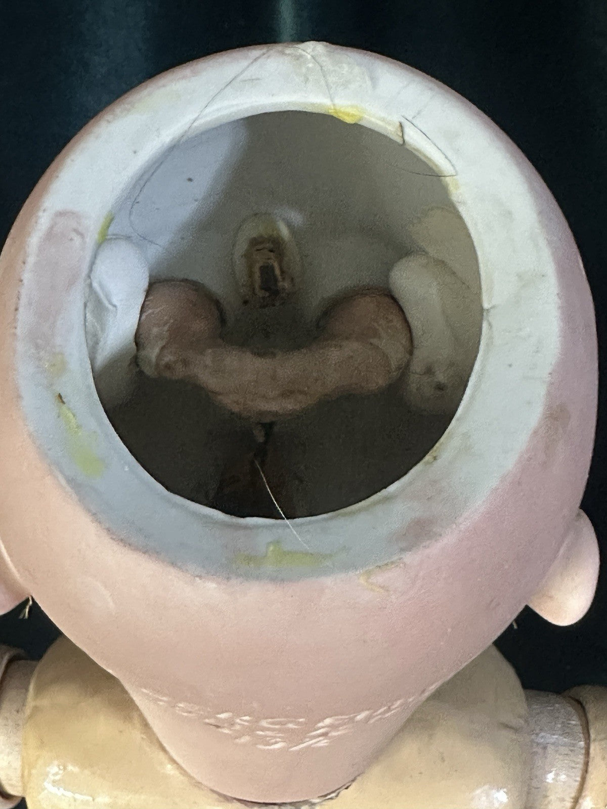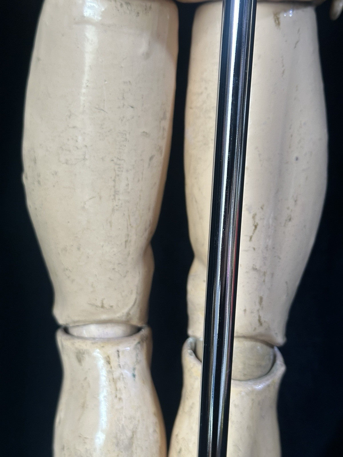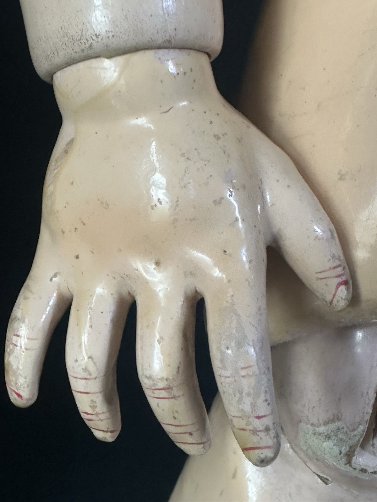 Composition body. Stringing is good; she can strike a pose. Has a few rough areas - see photos. Crazing, cracking, scratches are present to her composition body. Please look at the photos as they are part of description.