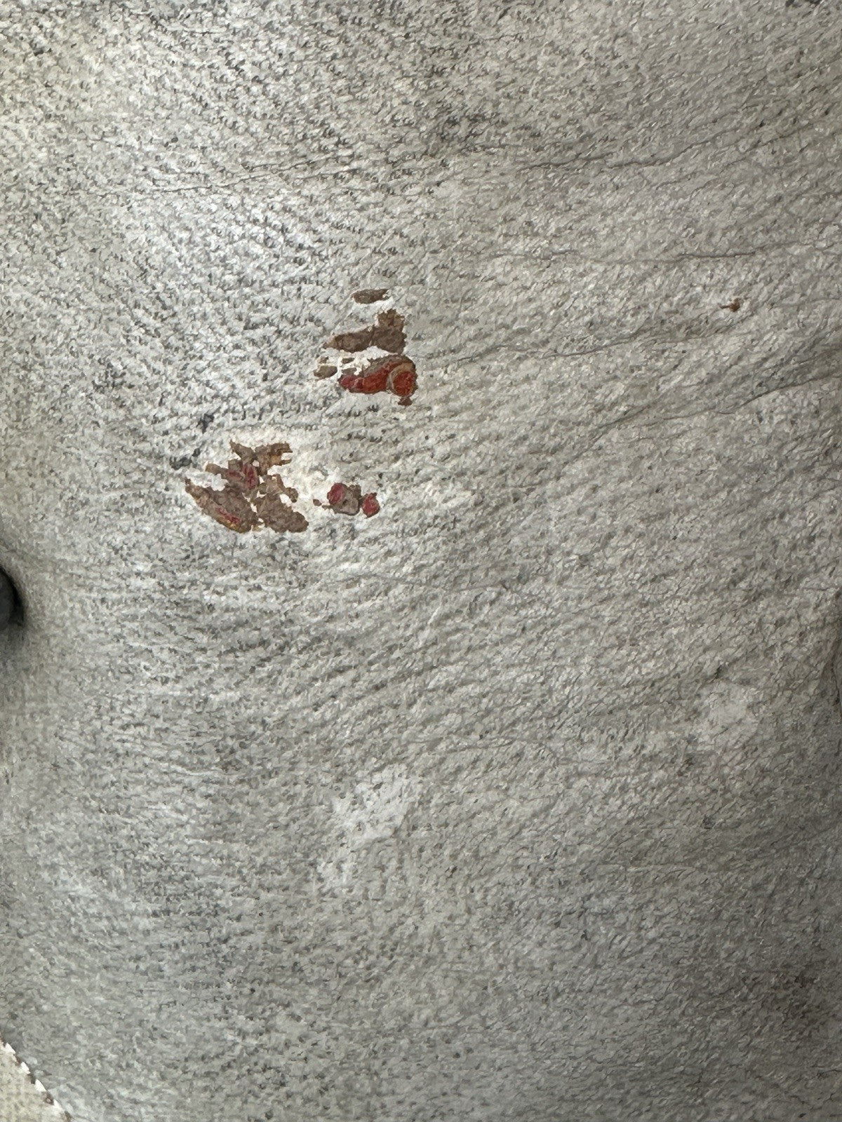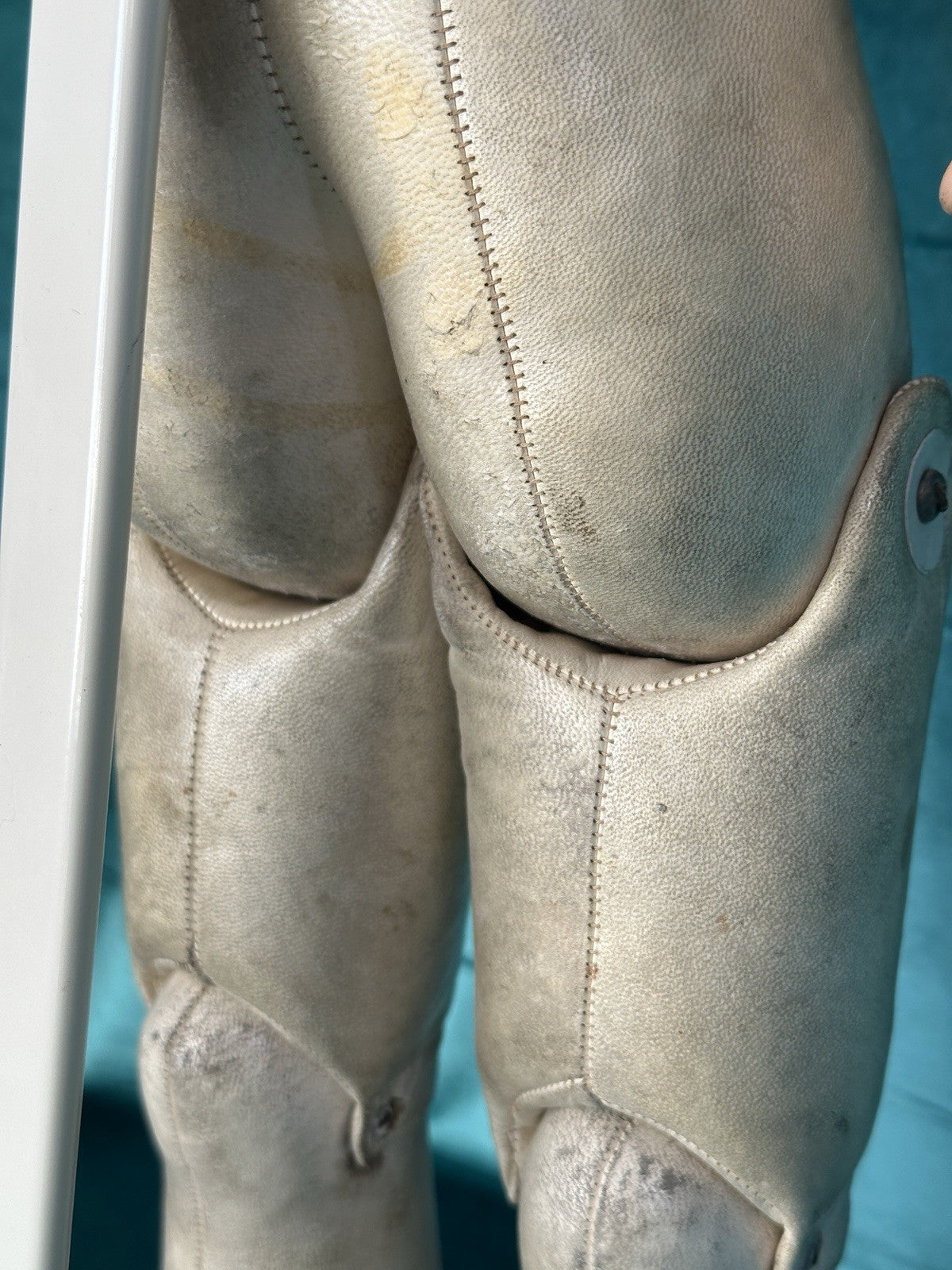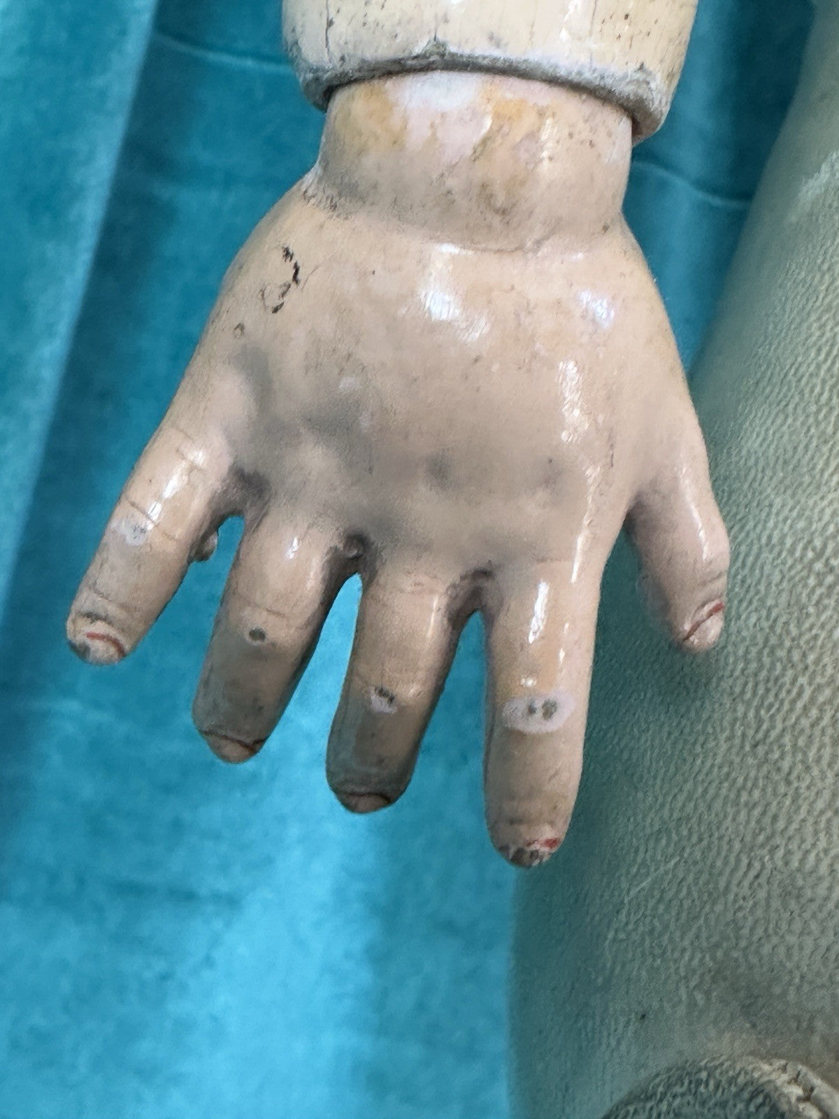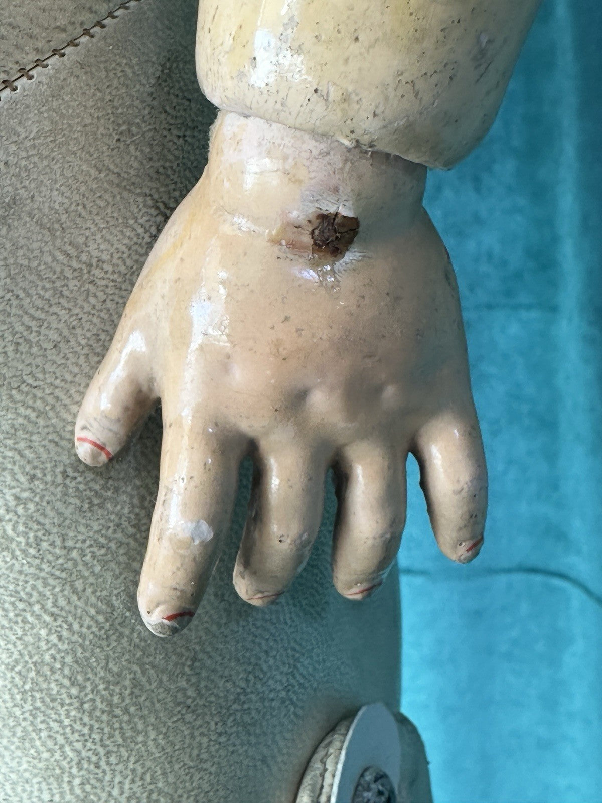 Kid leather body is in a good condition. No sawdust leakage. Has a few rough areas - see photos. Composition arms. Please look at the photos as they are part of description.