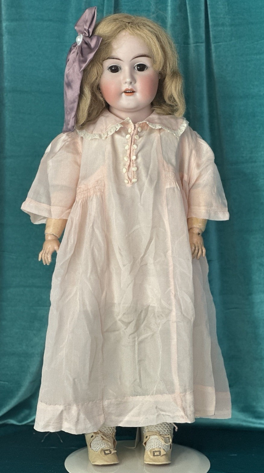 Bisque socket head, brown glass sleepy eyes. No visible damage to the bisque head. Painted lower and upper lashes. Real upper lashes; partially gone. Open mouth with teeth. Her wig seems to be antique; not attached to her head.